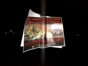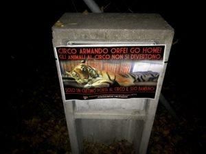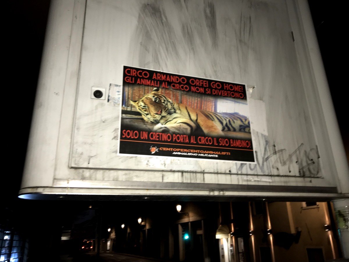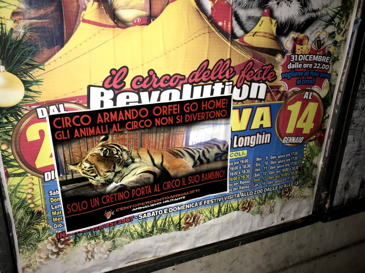 Il circensi dell’Armando Orfei evidentemente non hanno capito il “messaggio” che abbiamo loro porto a Mestrino nella loro precedente tappa. Forse, svegliandosi domani mattina, ne capiranno il senso. Nella notte tra martedì 11 e mercoledì 12 dicembre, i nostri Militanti sono tornati in azione a Padova oscurando i loro manifesti con locandine personalizzate per l’occasione. Tappezzate anche alcune zone del centro di Padova e l’area che verrà destinata ai circensi nella tappa Padovana in via Longhin.