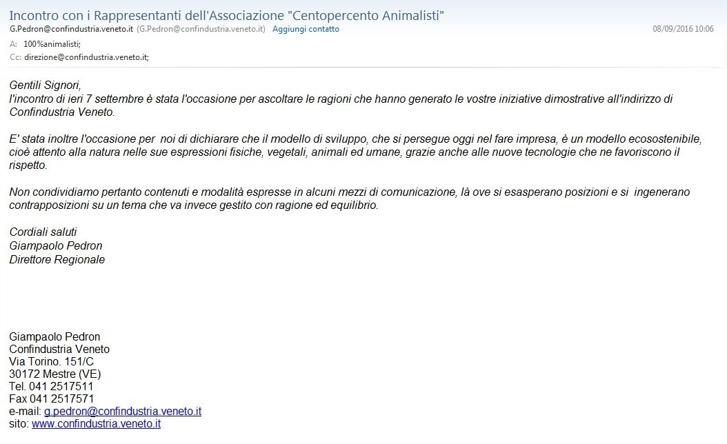 La mail arrivata a Centopercentoanimalisti in data 8 settembre dal sig. Pedron, direttore regionale di Confindustria, si può riassumere in tre punti: nel primo, Pedron definisce l’incontro con CENTOPERCENTOANIMALISTI un’occasione per ascoltare le loro motivazioni. Ma queste motivazioni erano state chiaramente espresse nel corso delle varie azioni da parte del nostro movimento e ribadite durante la riunione. Quindi Pedron passa a un panegirico del modello di sviluppo dell’impresa, secondo lui ecosostenibile e rispettoso di umani, Animali, ambiente. Su questo c’è molto da discutere, ma non è pertinente l’argomento attuale.