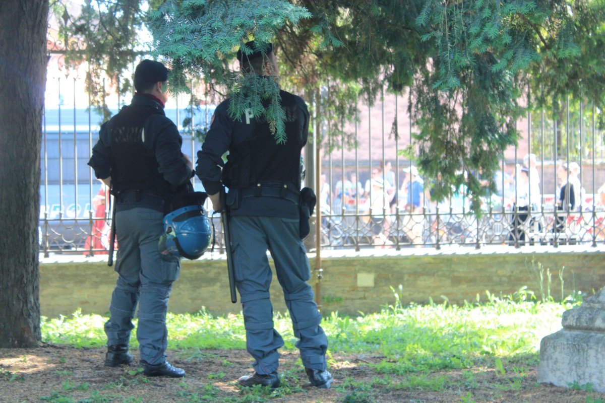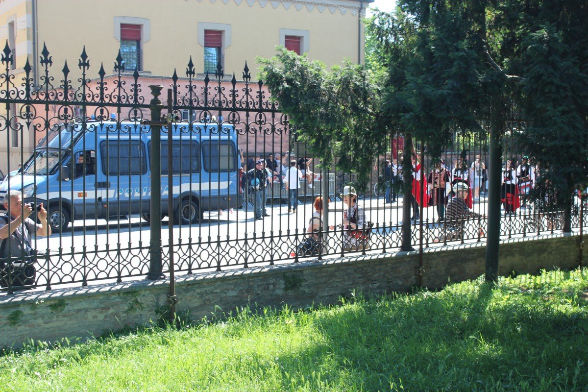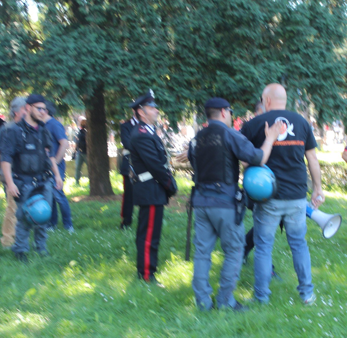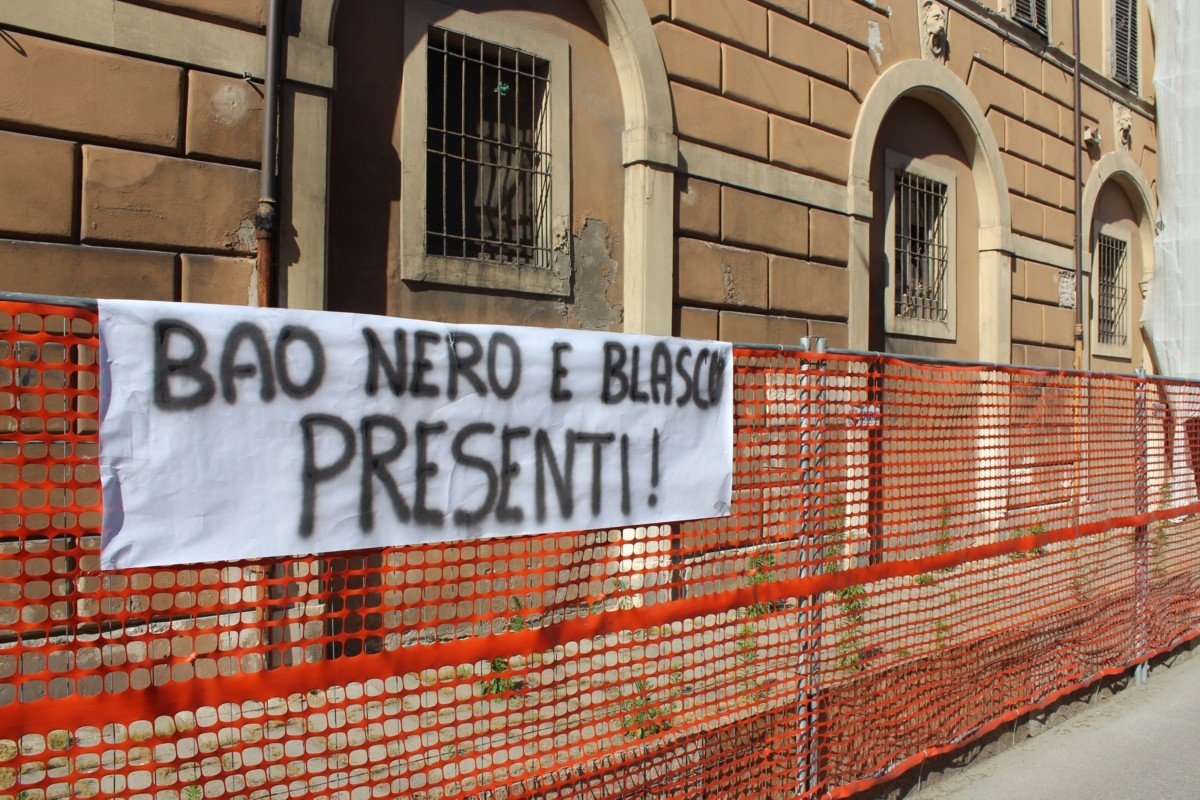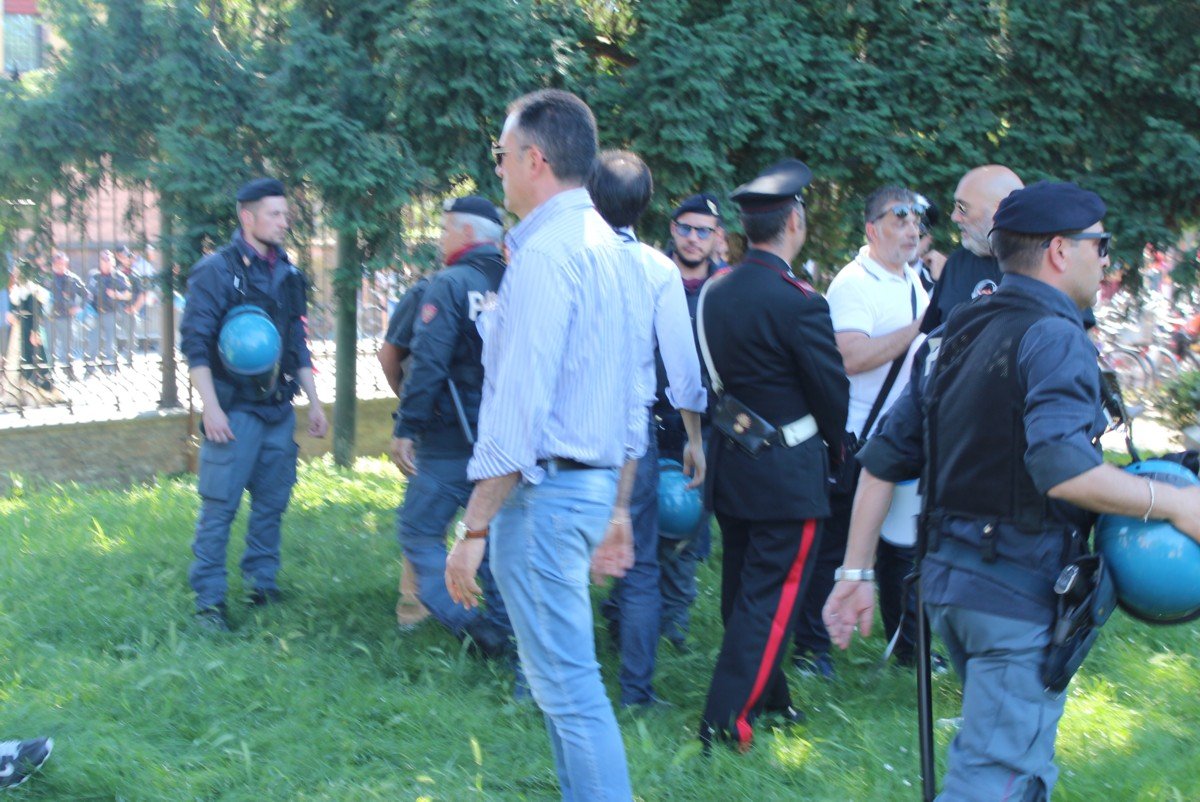 Prima hanno assistito al passaggio del corteo storico, con alcune tensioni, commentando; quindi hanno raggiunto la consueta postazione, a poche decine di metri da Piazza Ariostea, dove ha luogo la corsa di Asini e di Cavalli. Oltre a slogan e cori contro il Palio, il pensiero dei militanti è andato all’assessore Modonesi, gran sostenitore di questo infausto evento.