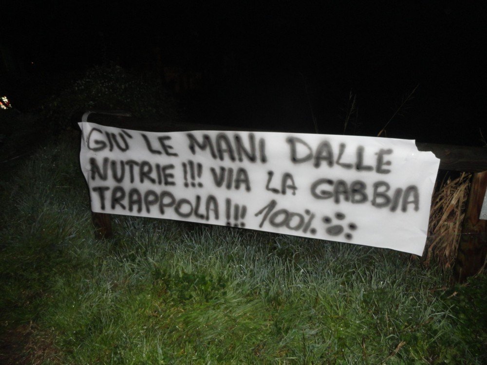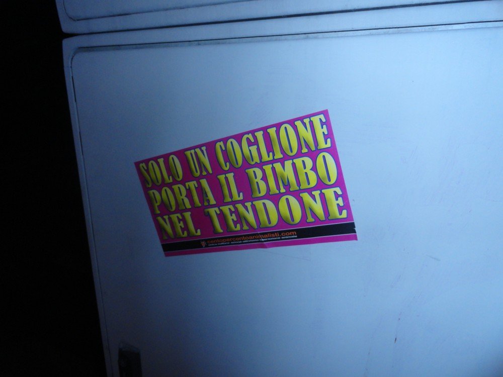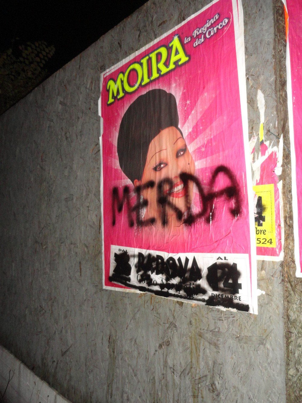 Nella notte tra il 9 e il 10 dicembre, militanti di CENTOPERCENTOANIMALISTI hanno ancora una volta mostrato alla Moira quanto sia sgradita la sua presenza a Padova oscurando con locandine adesive ironiche i suoi (pochi) manifesti rimasti intatti e “punendo” i negozianti che hanno sponsorizzato il suo spettacolo nelle vetrine, anche in quest’ultimo caso, pochi per fortuna, a dimostrazione di quanto l’azione di Centopercentoanimalisti sia stata efficace in città.