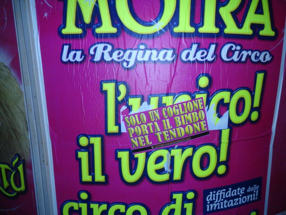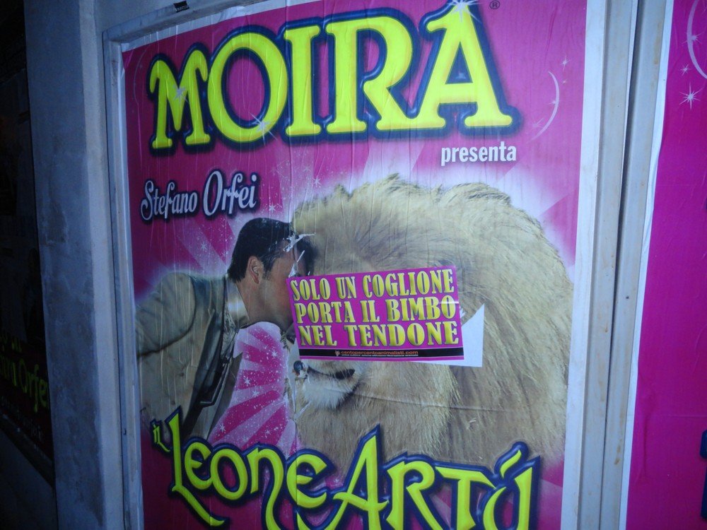 Ci fa piacere sapere che l’affluenza di pubblico agli spettacoli del circo di Moira Orfei, a Padova, è stata scarsissima. Solo gente con livello culturale molto basso e sensibilità zero può continuare a dare i propri soldi per entrare nel maledetto tendone.