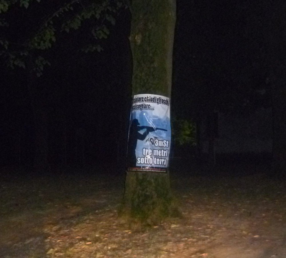 Militanti di CENTOPERCENTOANIMALISTI, nella notte tra il 29 e 30 agosto, hanno affisso manifesti ironici contro i cacciatori nel parco dove si svolgerà la “festa” e oscurato numerosi manifesti che pubblicizzavano la vergogna di Annone Veneto.