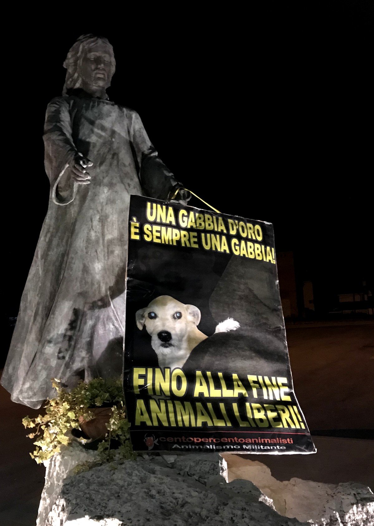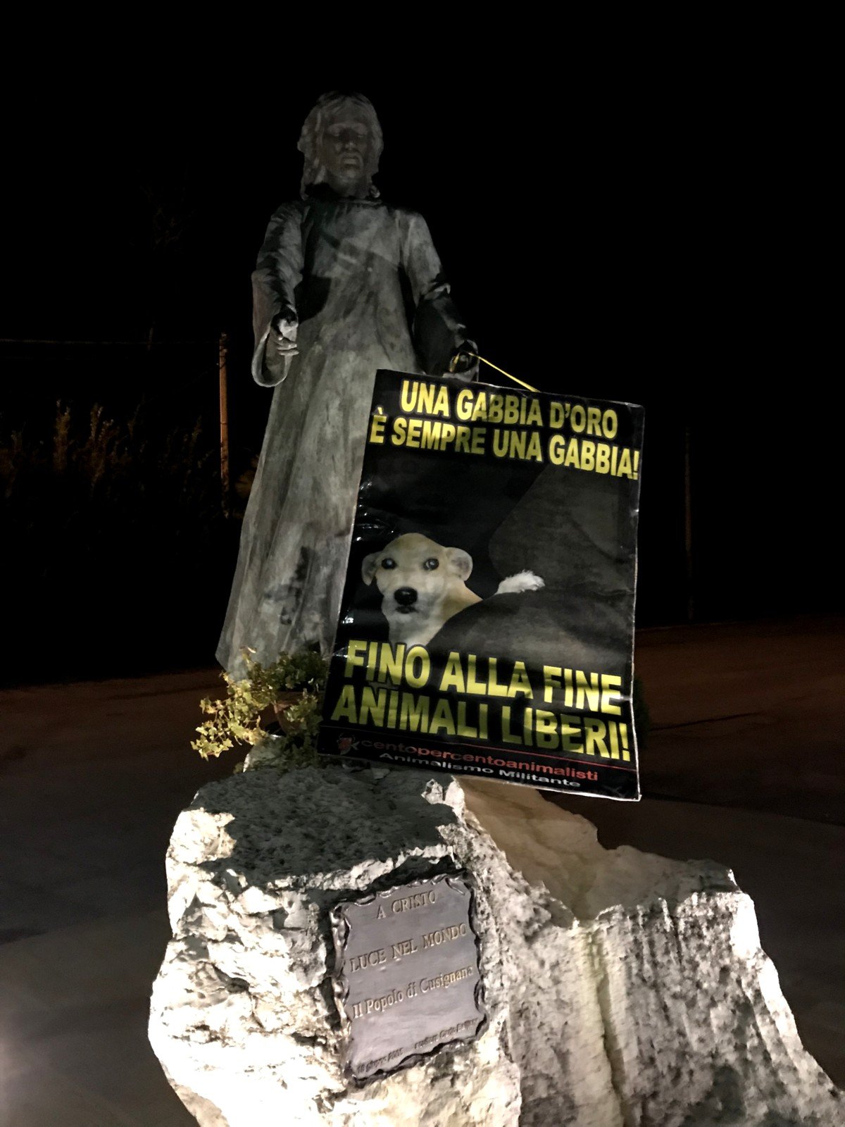 Nella notte tra il 9 e il 10 ottobre, militanti del nostro Movimento sono tornati a Cusignana ed hanno appeso un manifesto sulla mano del Gesù nel piazzale della chiesa, per ricordare al parroco che CENTOPERCENTOANIMALISTI non molla.