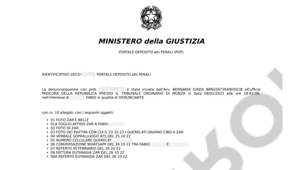 In casa non c’era nessuno ed i vicini non hanno risposto. Hanno così deciso di chiamare i Carabinieri, i quali arrivati prontamente hanno constatato la situazione ed è stata fatta intervenire l’ASL veterinaria, il cui verbale trovate in allegato: è stato riscontrato lo stato di malnutrizione (“stato di nutrizione deficitario”) ed è stato intimato ai proprietari di consegnare la cartella clinica di Zar.