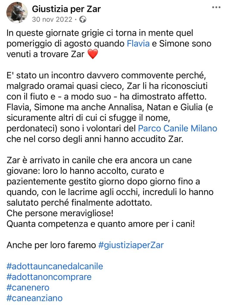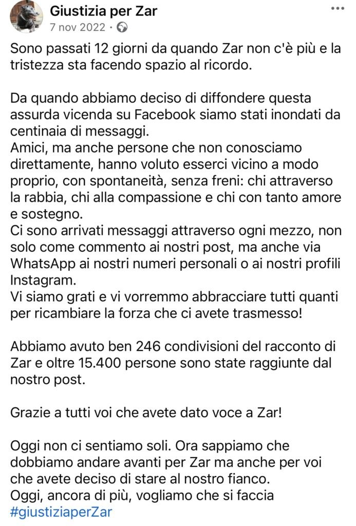 Lasciamo ai posteri l’ardua sentenza, noi vogliamo ricordare il povero Zar come vera e unica vittima di questa campagna diffamatoria, poiché riteniamo vergognoso strumentalizzare la morte di un animale innocente.