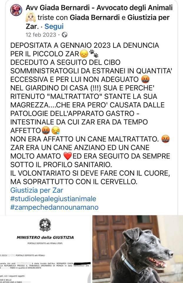 Come previsto, gli assassini di Zar, Arianna Scaruffi, Andrea Teruzzi, Roberto Serafin del fronte animalista hanno scritto un post incolpando i proprietari di Zar di essere i responsabili della sua morte. In realtà gli unici assassini sono loro, dato che hanno pure ammesso che gli avevano dato del cibo. Mossa fatale per il povero Zar, successivamente deceduto. Quel povero Cane era stato adottato in canile, la classica adozione del cuore, i suoi proprietari gli volevano un bene dell’anima e lo stavano curando, come dimostrano gli screenshot che seguono. I tre deficienti hanno raccontato un sacco di balle per cercare di discolparsi dalla cazzata che hanno fatto, episodio gravissimo che ha portato alla morte Zar. Questo il referto, che quei ritardati del fronte del disagio hanno ovviamente ignorato (chissà perchè), leggete le cause che hanno ucciso Zar. Arianna Scaruffi in particolare, oltre che ad offendere e bullizzare come al solito, fa pure la vittima, ha scritto di recente di essere addolorata per la morte di Zar, peccato che lo scrive a due anni di distanza. Buffona, fai pena! Va in giro con il marsupio in pelle, vaccinazioni complete e dice di amare gli Animali.