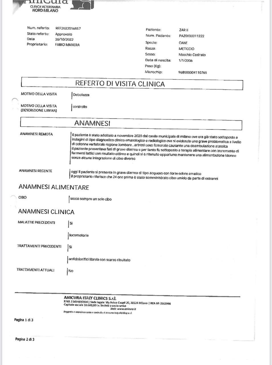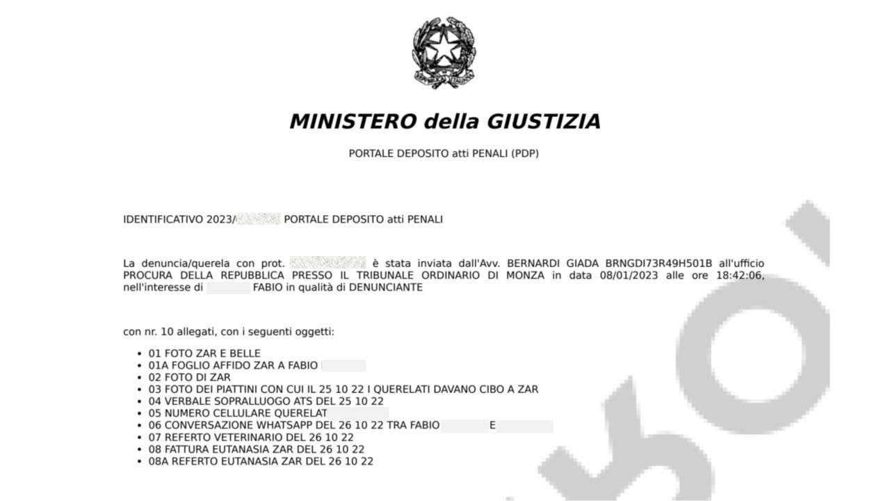 In casa non c’era nessuno ed i vicini non hanno risposto. Hanno così deciso di chiamare i Carabinieri, i quali arrivati prontamente hanno constatato la situazione ed è stata fatta intervenire l’ASL veterinaria, il cui verbale trovate in allegato: è stato riscontrato lo stato di malnutrizione (“stato di nutrizione deficitario”) ed è stato intimato ai proprietari di consegnare la cartella clinica di Zar.