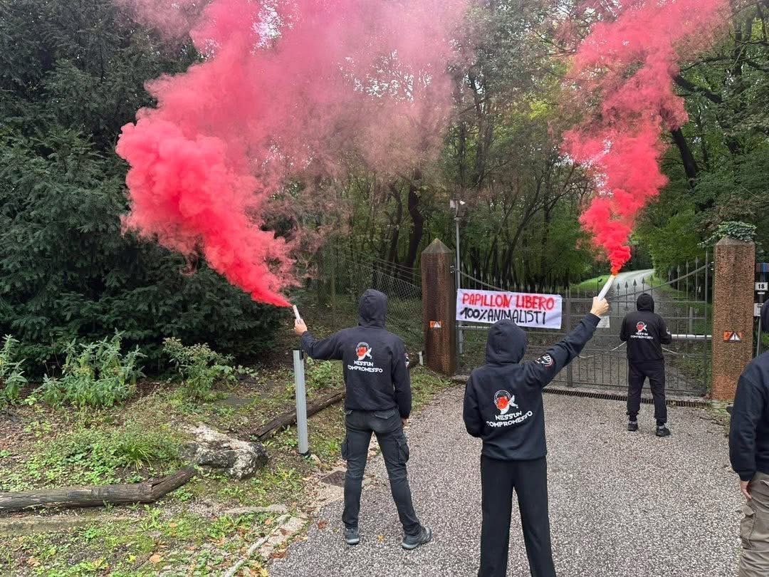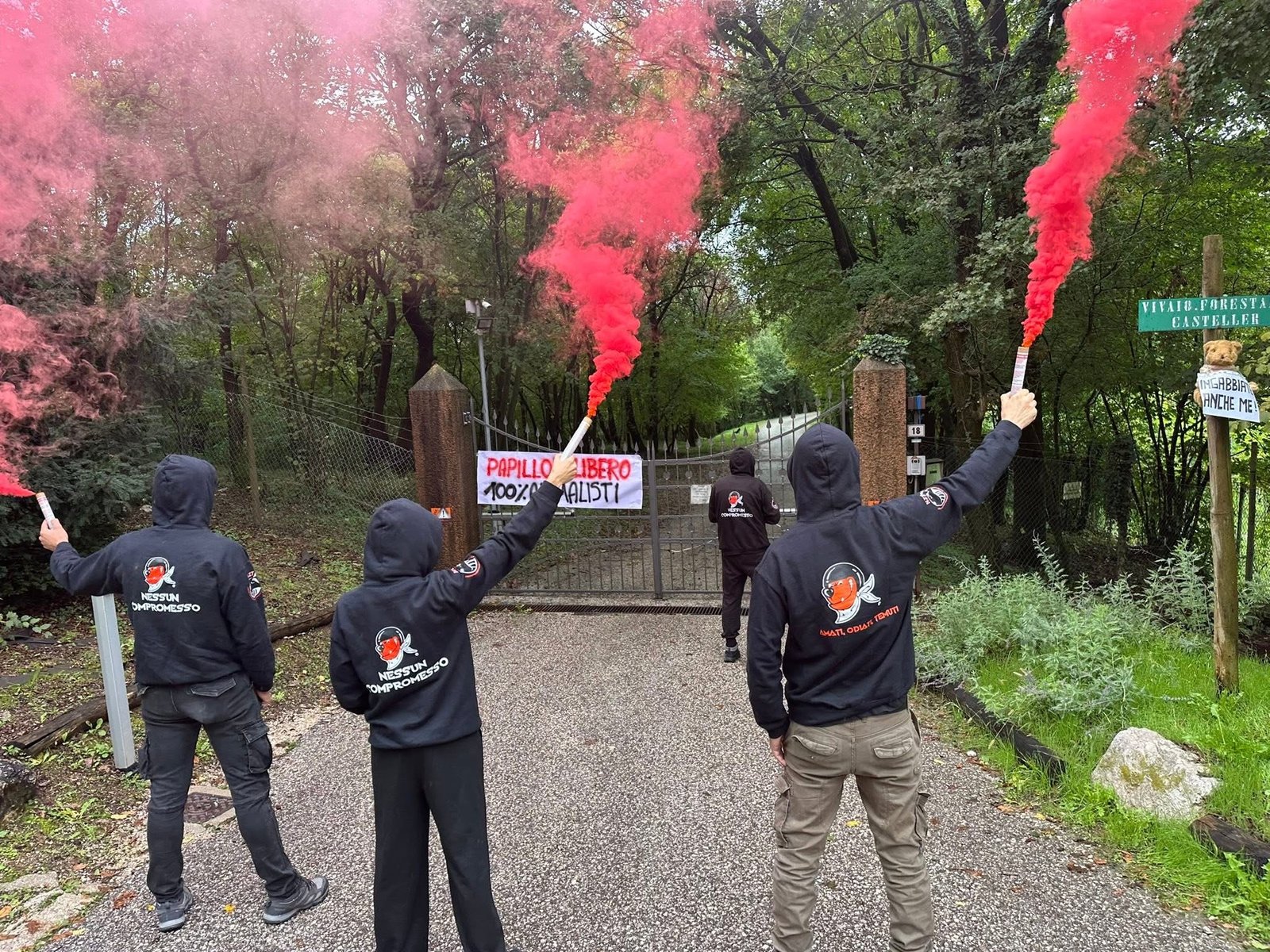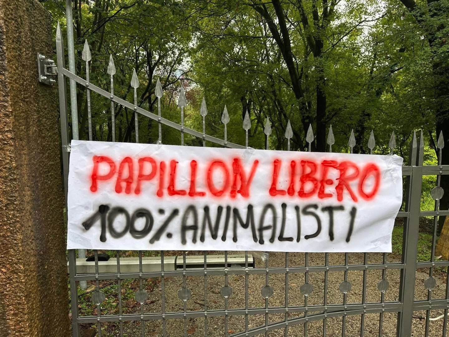 Inoltre, hanno affisso uno striscione che invoca la liberazione di Papillon e acceso dei fumogeni (ecologici), per far sentire a Papillon la nostra presenza. Non lo lasceremo solo!