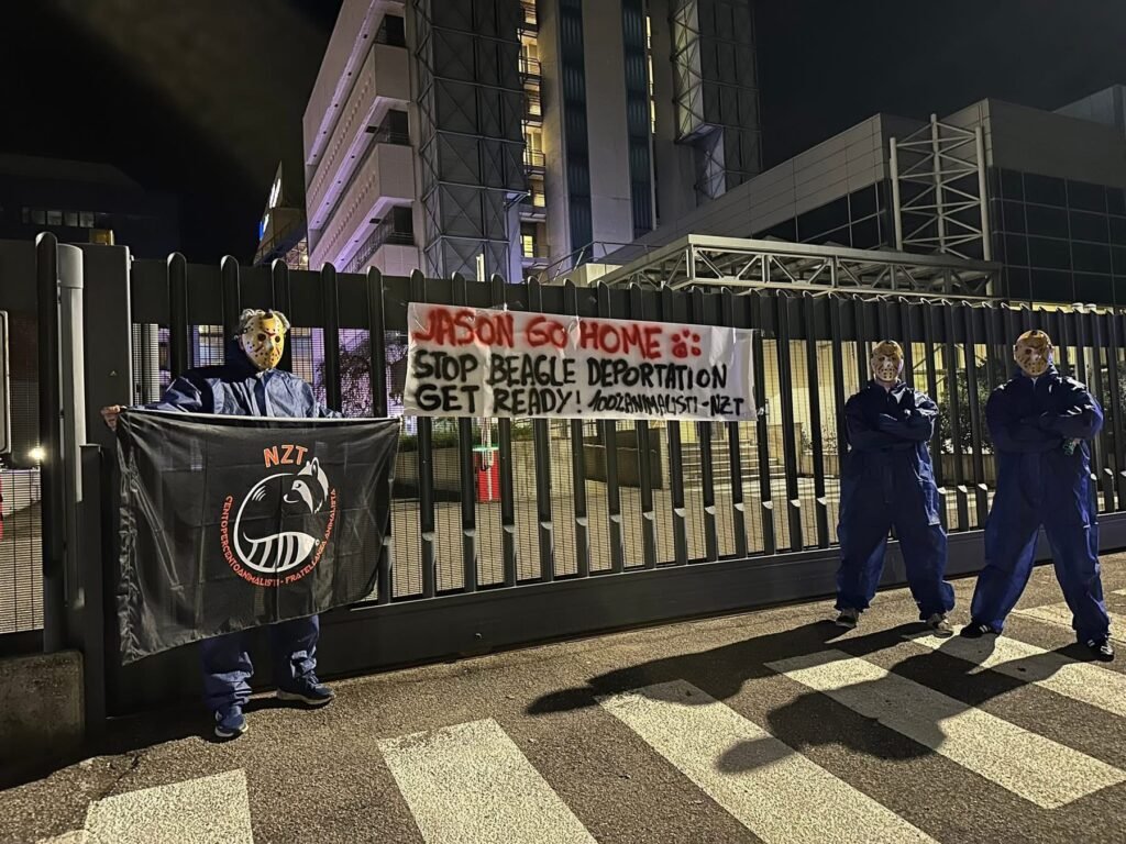Martedì 22 aprile in prima serata, Militanti del Movimento CENTOPERCENTOANIMALISTI si sono recati davanti ai cancelli di Aptuit ed hanno affisso uno striscione: “JASON GO HOME, STOP BEAGLE DEPORTATION. GET READY!”