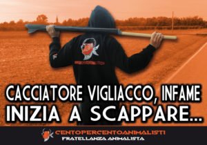 Militanti di CENTOPERCENTOANIMALISTI, nella notte tra il 24 e 25 giugno, hanno affisso in via levà in zona San Pietro Viminario (Padova), tra Conselve e Cartura, manifesti che indicano chiaramente l’atteggiamento da tenere nei rapporti con i cacciatori, ma soprattutto un avviso per gli assassini legalizzati che CENTOPERCENTOANIMALISTI, all’apertura della caccia, soprattutto in quella zona, non starà a guardare.
