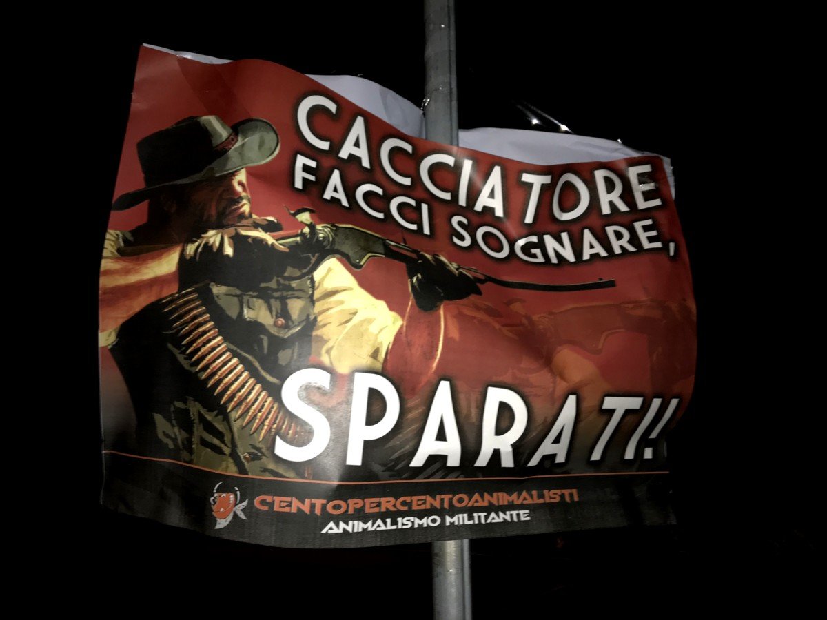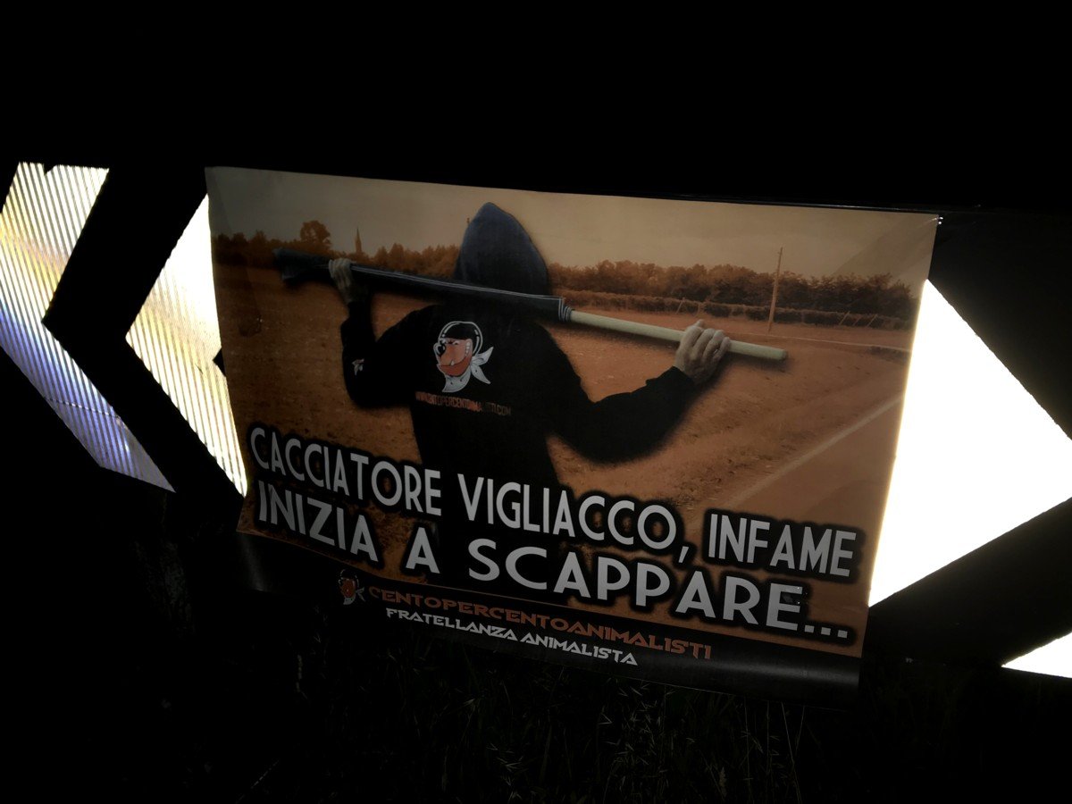 Militanti di CENTOPERCENTOANIMALISTI, nella notte tra il 24 e 25 giugno, hanno affisso in via levà in zona San Pietro Viminario (Padova), tra Conselve e Cartura, manifesti che indicano chiaramente l’atteggiamento da tenere nei rapporti con i cacciatori, ma soprattutto un avviso per gli assassini legalizzati che CENTOPERCENTOANIMALISTI, all’apertura della caccia, soprattutto in quella zona, non starà a guardare.