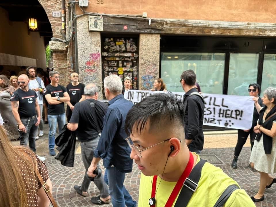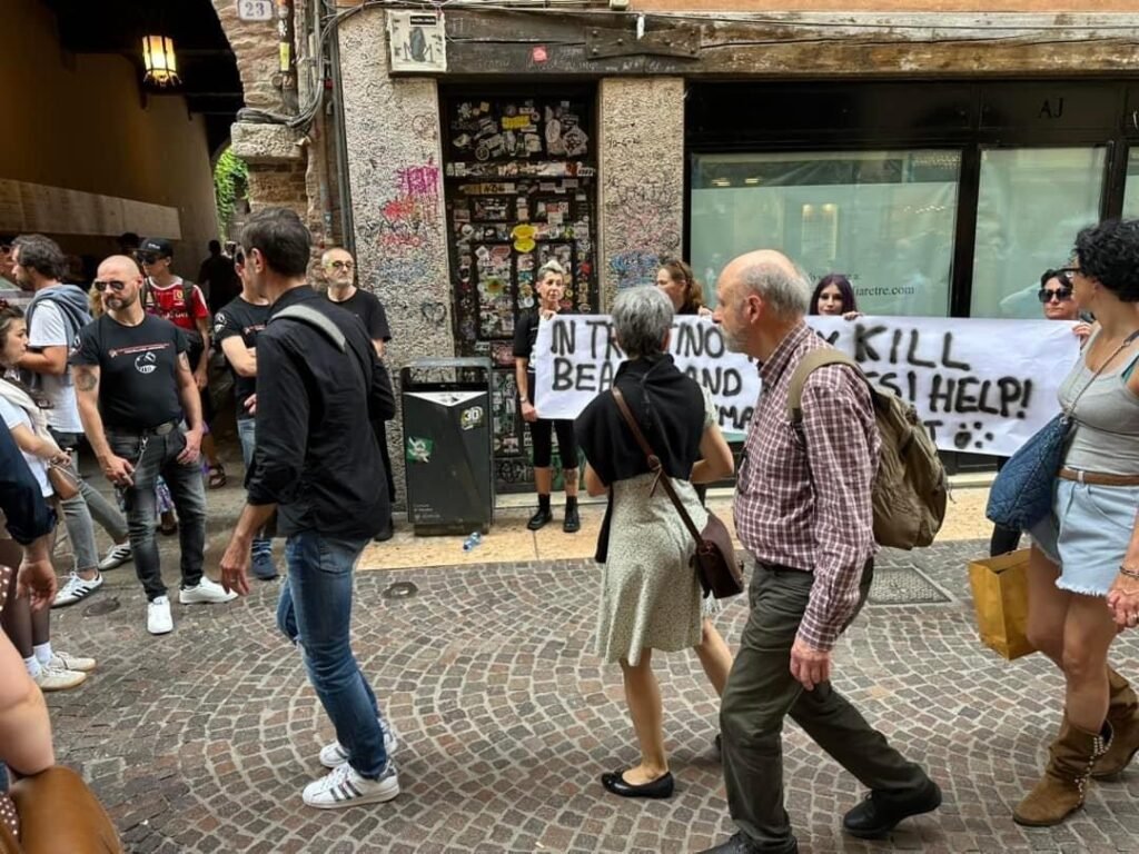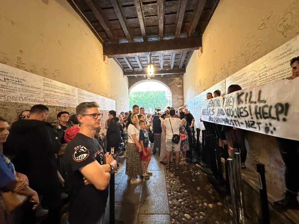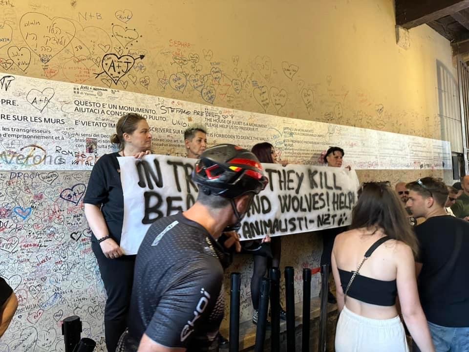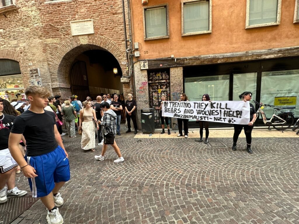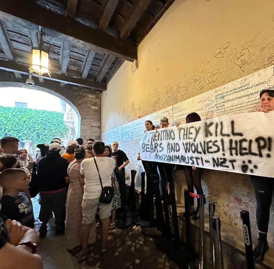 Domenica 2 giugno alcuno militanti del Movimento Centopercentoanimalisti si sono recati in via Cappello, davanti ala Casa di Giulietta, con uno striscione in lingua inglese per denunciare la politica distruttiva delle giunta trentina, contro gli Animali Liberi, in primo luogo Orsi e Lupi da tempo nel mirino dei cacciatori e del presidente Fugatti.