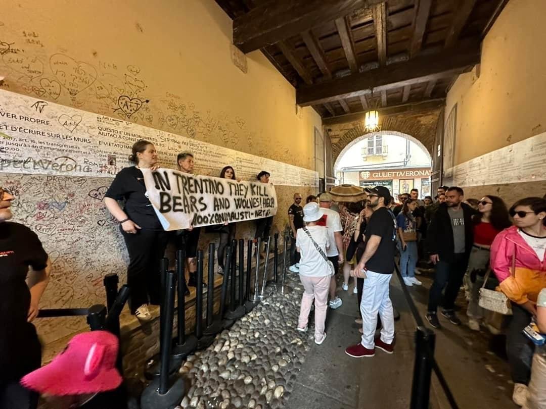 Domenica 2 giugno alcuno militanti del Movimento Centopercentoanimalisti si sono recati in via Cappello, davanti ala Casa di Giulietta, con uno striscione in lingua inglese per denunciare la politica distruttiva delle giunta trentina, contro gli Animali Liberi, in primo luogo Orsi e Lupi da tempo nel mirino dei cacciatori e del presidente Fugatti.