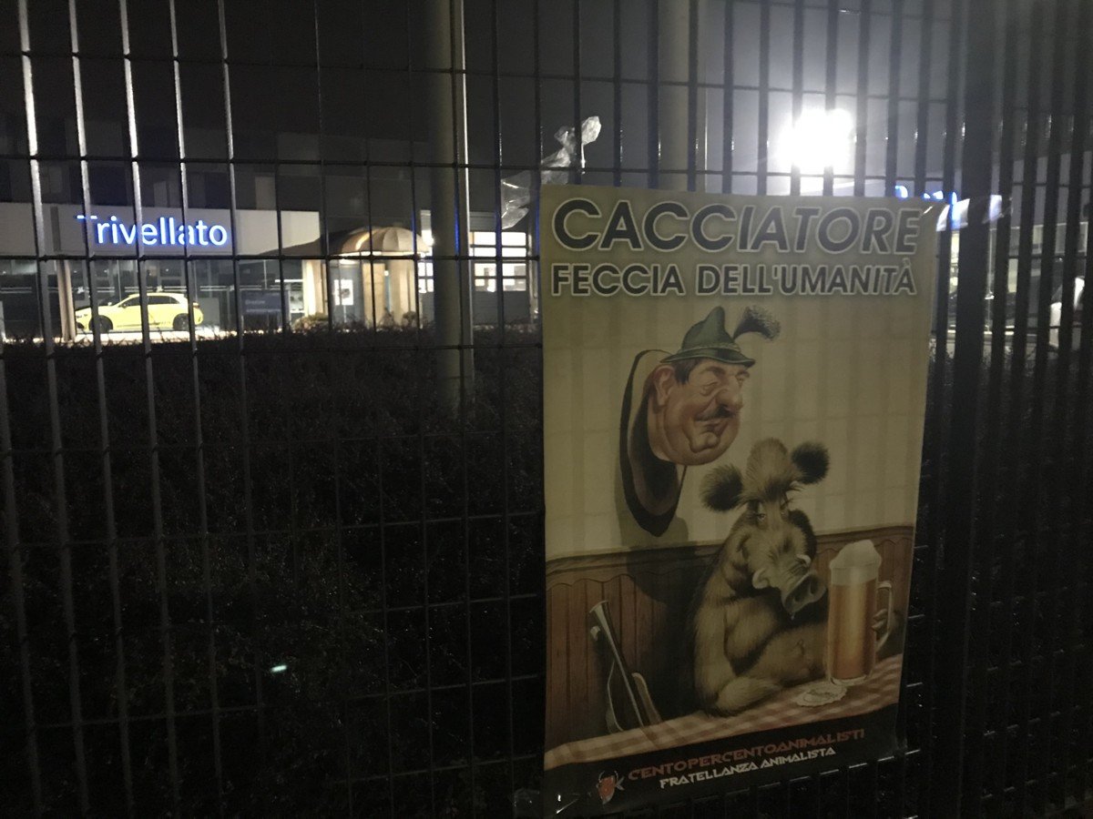 Nella notte tra l’11 e 12 febbraio, Militanti del Movimento Centopercentoanimalisti hanno affisso un manifesto sul cancello della sede principale della ditta Trivellato, a Torri di Quartesolo (VI) per ribadire la nostra opinione sulla categoria dei cacciatori in generale. E ribadiamo l’invito chiaro a chi ama gli Animali: concessionari di auto ce ne sono tanti. Evitate di sovvenzionare i cacciatori!