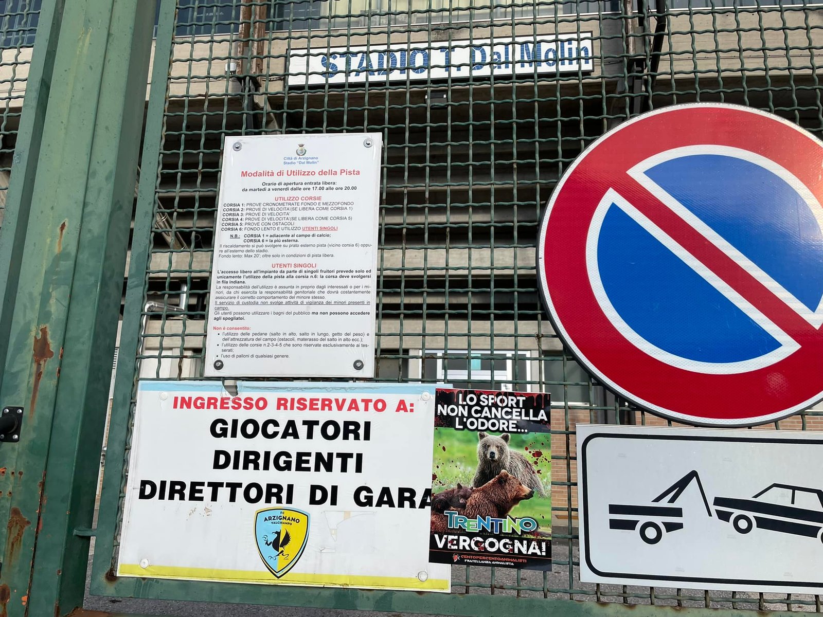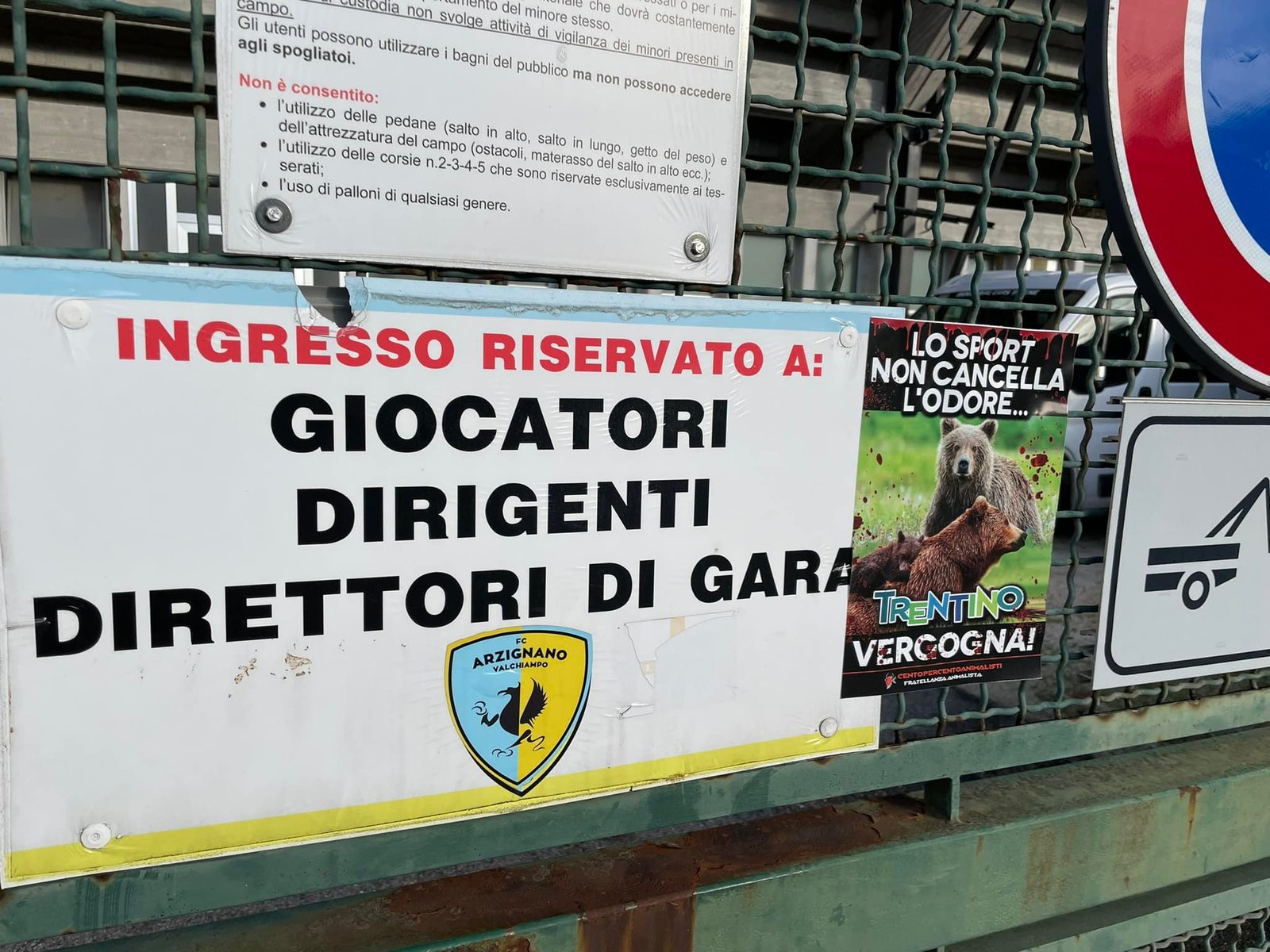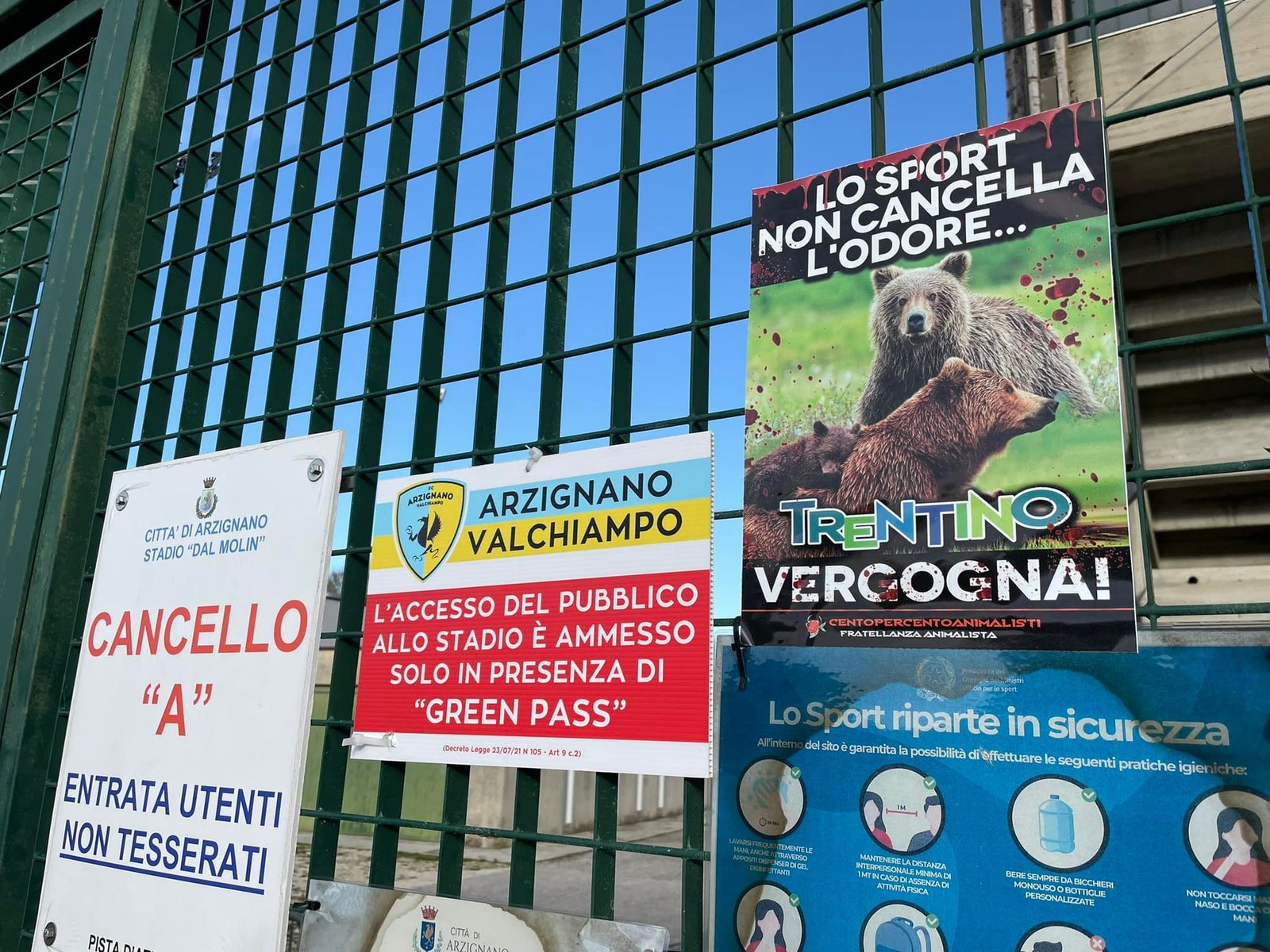 Domenica 5 dicembre, il Levico Terme giocherà in casa della capolista Arzignano (Vicenza). I nostri Militanti quindi, lunedì pomeriggio 29 novembre, hanno affisso sui cancelli dello stadio “dal Molin” manifesti adesivi, per ricordare le nefandezze compiute in Trentino, contro Orsi, Cervi, e di recente anche contro i poveri Cormorani.