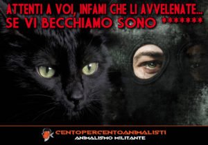 In attesa che vengano individuati i colpevoli, militanti di CENTOPERCENTOANIMALISTI, nella notte tra il 1 e 2 aprile, hanno effettuato un sopralluogo nella zona degli avvelenamenti ed hanno affisso una paio di manifesti sulla recinzione del casolare. A buon intenditore poche parole. Alcuni Gatti della colonia hanno assistito all’affisione notturna dei nostri Militanti, la leggenda dice che i Felini presenti durante un’azione Animalista, siano Angeli di buon auspicio.