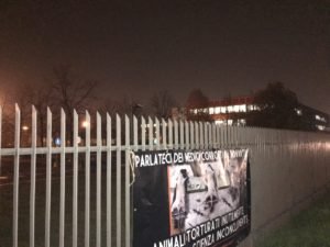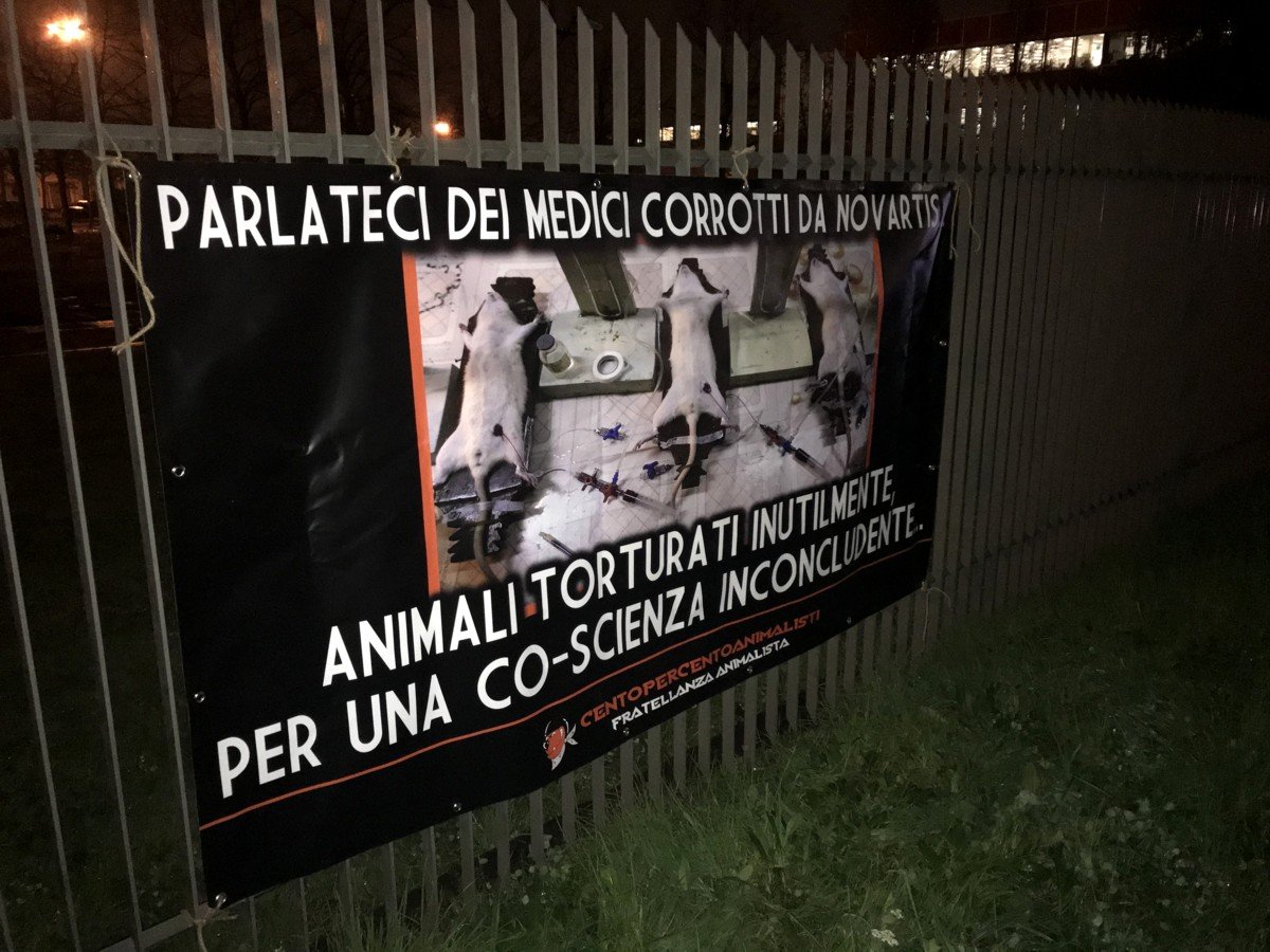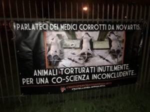 Per far capire a questi signori che non tutti stanno in silenzio a subire, nella notte tra il 21 e 22 novembre, Militanti di Centopercentoanimalisti hanno affisso sulle recinzioni della sede “Novartis farma S.P.A.” in via Saronnino ad Origgio (Varese), un enorme striscione provocatorio di denuncia diretto alla Multinazionale.