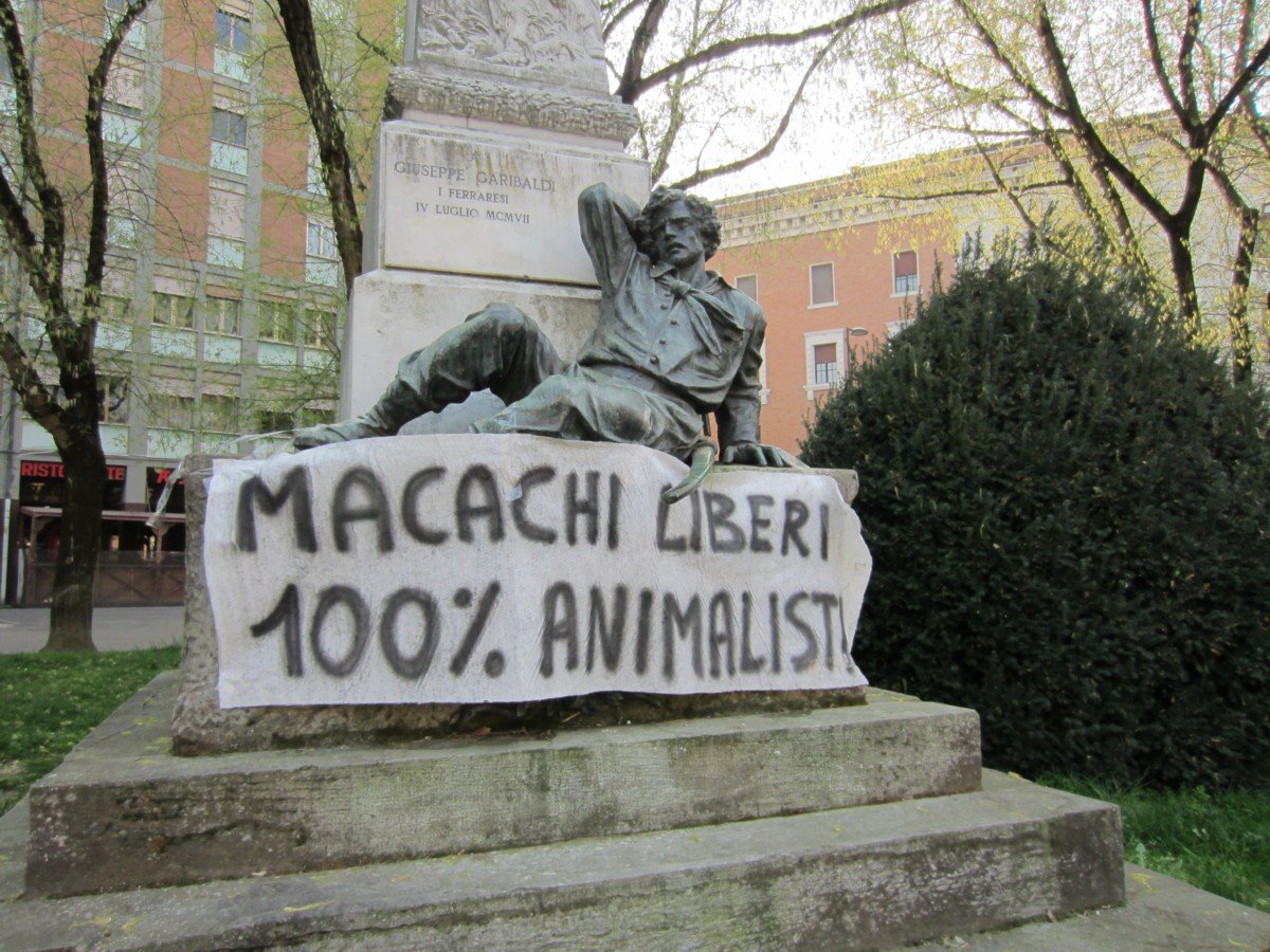 CENTOPERCENTOANIMALISTI continua la sua lotta contro l’utilizzo di Animali nella falsa sperimentazione, e in particolare per la salvezza e la liberazione dei Macachi detenuti a Ferrara. Nostri militanti, in pieno giorno mercoledì 22 marzo, hanno affisso all’interno dell’università di Ferrara vicino al luogo dove sono prigionieri i Macachi, uno striscione di notevoli dimensioni con la scritta “MACACHI LIBERI”, inoltre un altro striscione con la stessa scritta è stato posizionato sulla statua di Garibaldi in corso Cavour.