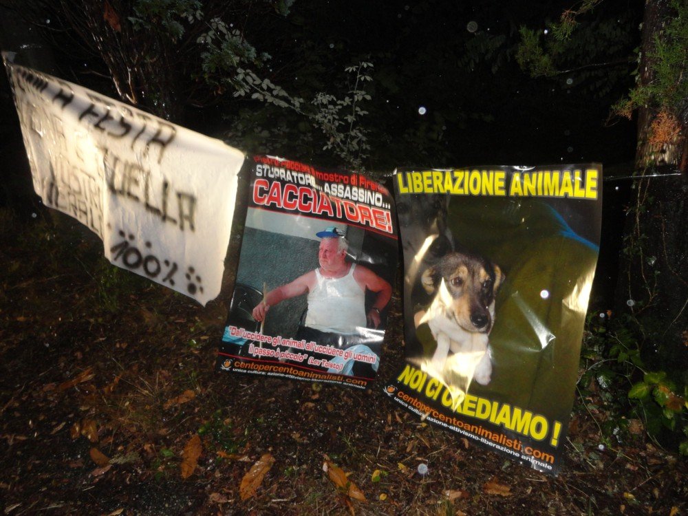Come primo atto di “partecipazione” alla “festa” del cacciatore, nella notte tra il 18 e 19 agosto, i nostri militanti hanno affisso in località San Bortolo a Castelcucco (nonostante la pioggia battente) uno striscione diretto ai cacciatori, più due manifesti, rispettivamente uno di liberazione Animale e uno con l’icona dei cacciatori, Pietro Pacciani.