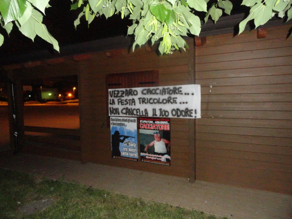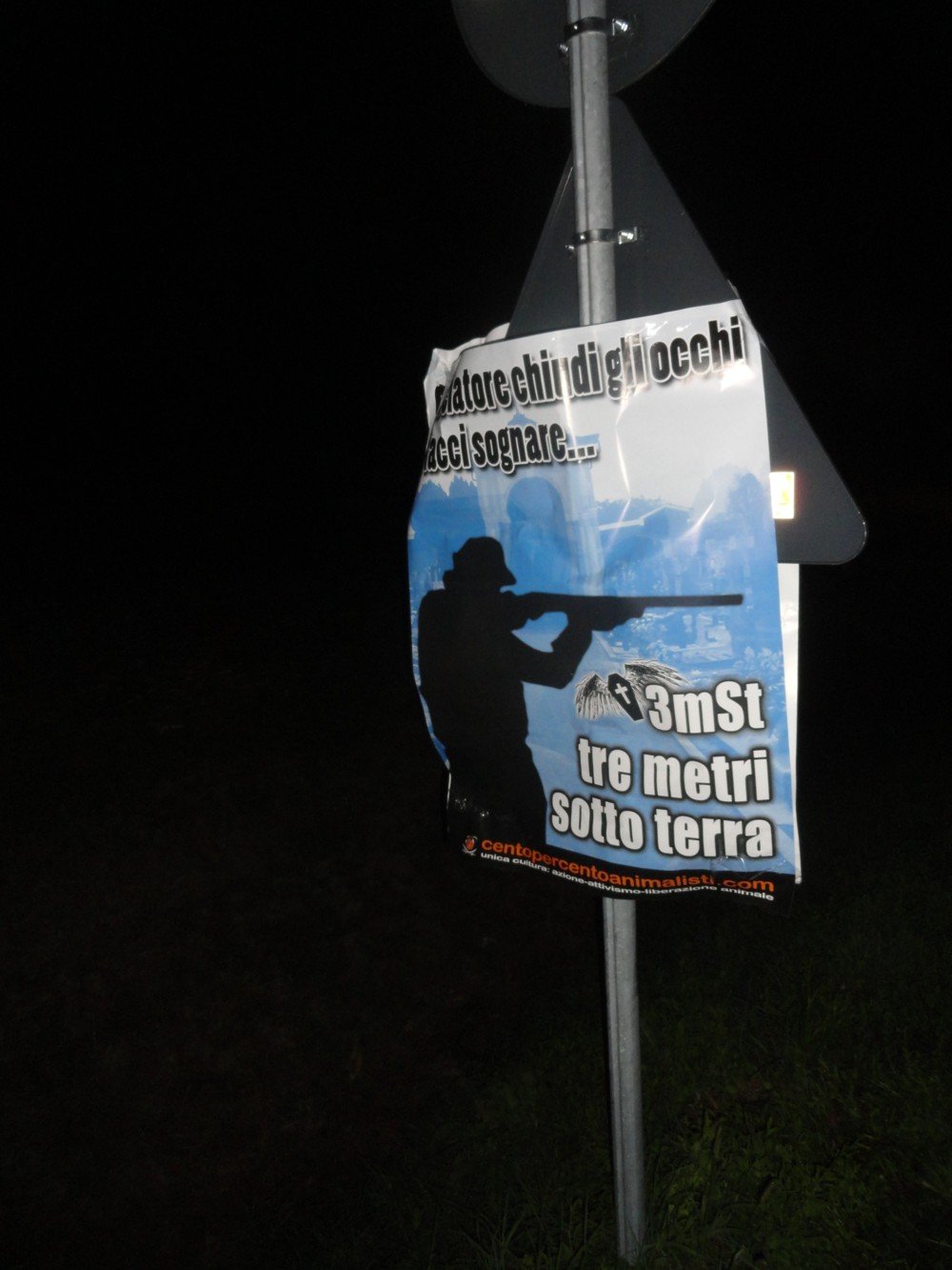 Nella notte tra il 23 e 24 settembre, militanti di CENTOPERCENTOANIMALISTI hanno affisso nei pressi di Villa Paoletti a Mareno di Piave, manifesti ironici contro la caccia e uno striscione di sfida diretto ai cacciatori, inoltre sono stati “abbelliti” alcuni cartelli della zona. Domenica prossima infatti, non sono escluse ronde dei nostri militanti nella zona, con la speranza di incontrare i cacciatori vigliacchi che hanno puntato contro i loro fucili e minacciato i ragazzi down.