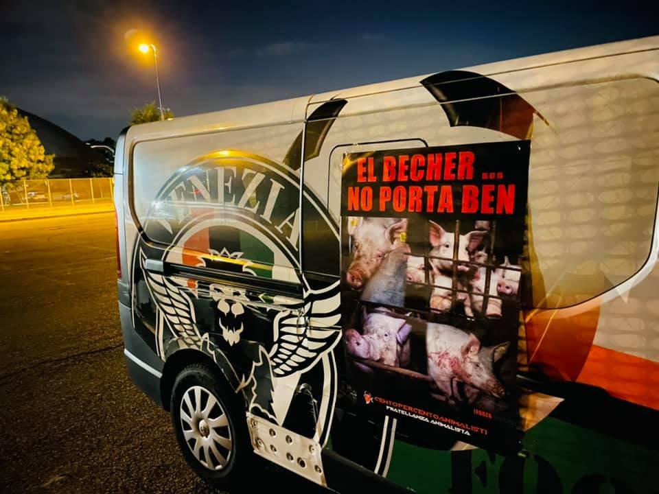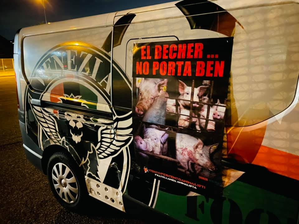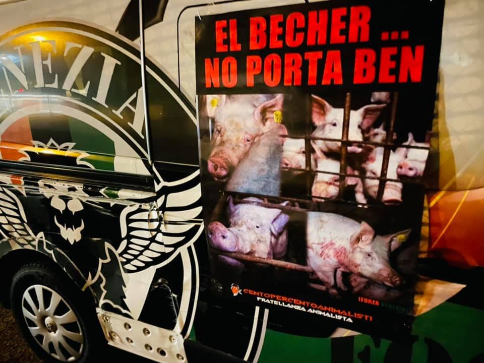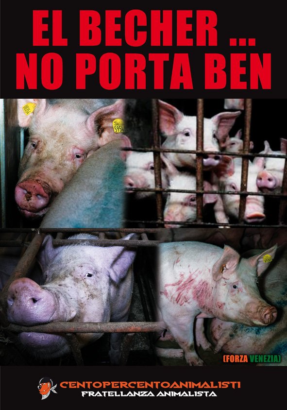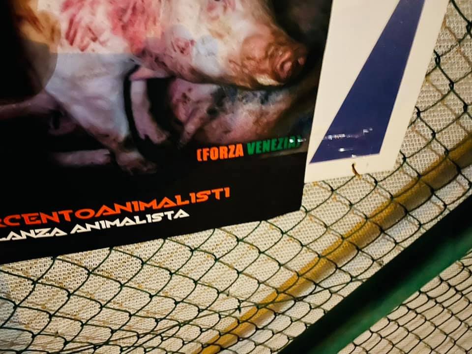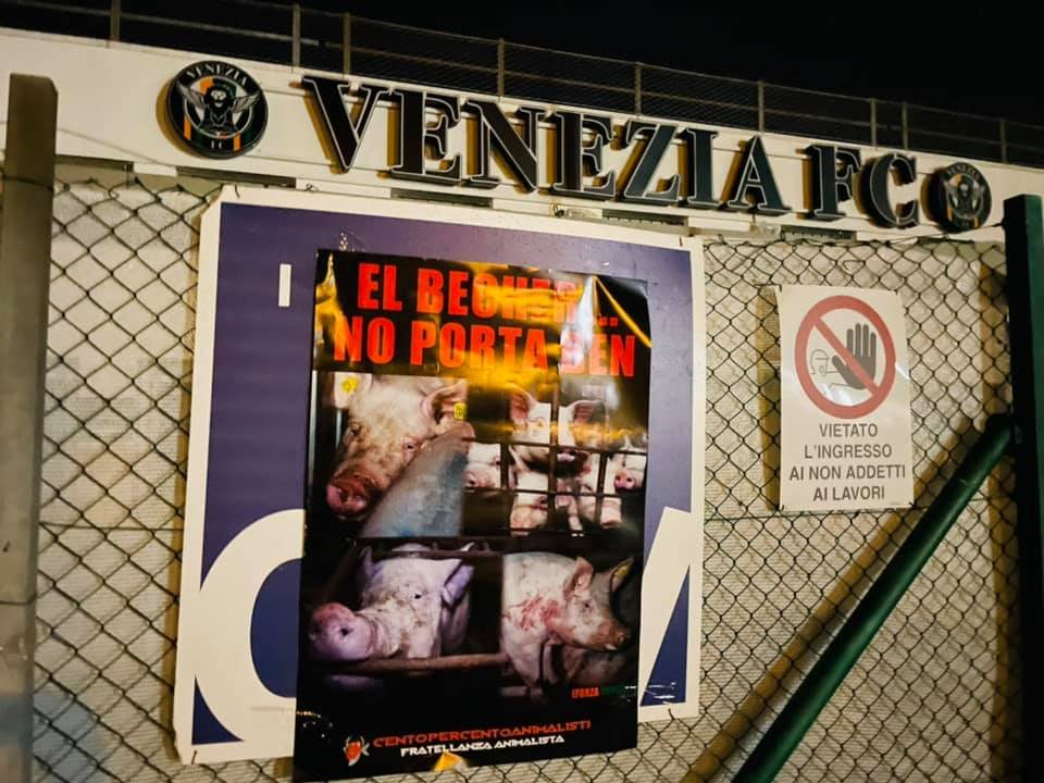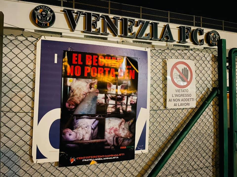Militanti di CENTOPERCENTOANIMALISTI, in prima serata di martedì 31 agosto, hanno affisso sui cancelli del campo sportivo “Taliercio”di Mestre e sul furgone del Venezia calcio, alcuni manifesti di “riflessione” su cosa subiscono i poveri Animali del becher. Inoltre un “forza Venezia” che non guasta, in basso a destra del manifesto.