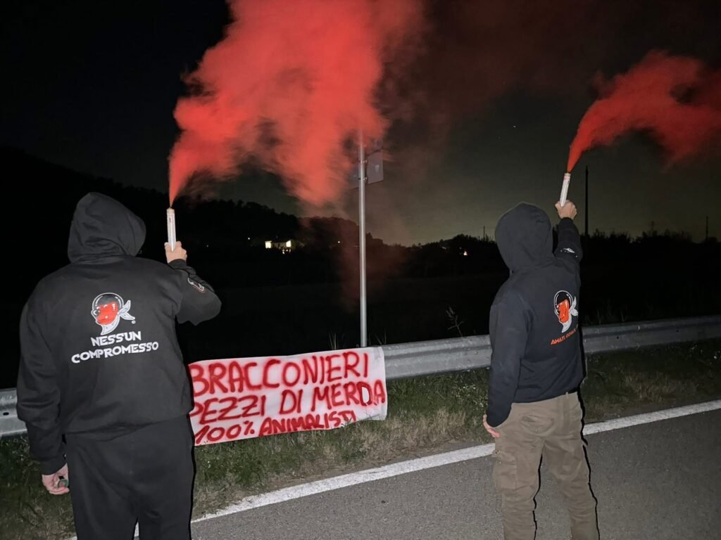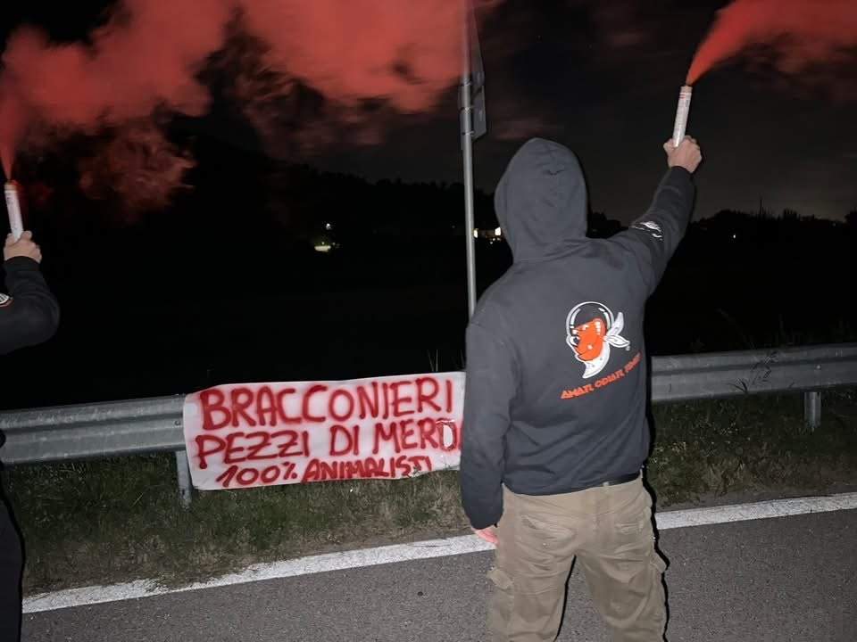 Fumogeni e uno striscione al Cataio di Battaglia Terme (Pd). In nostri Militanti, venerdì 3 ottobre in tarda serata, sono entrati in azione in zona dell’antica reggia dei Colli Euganei, per far capire ai bracconieri (cacciatori che non pagano la licenza) che la misura è colma.