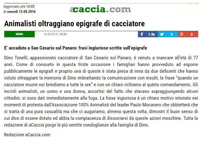 In rete sta girando la foto di un’epigrafe dove qualcuno ci ha scritto sopra qualcosa. Il tipo defunto è un cacciatore, tuttavia, la zona non è “battuta” dai Centopercentoanimalisti, le scritte sopra però, richiamano effettivamente i nostri slogan, non è la prima volta che altri Animalisti ci copiano e la cosa non mi dispiace, anzi.