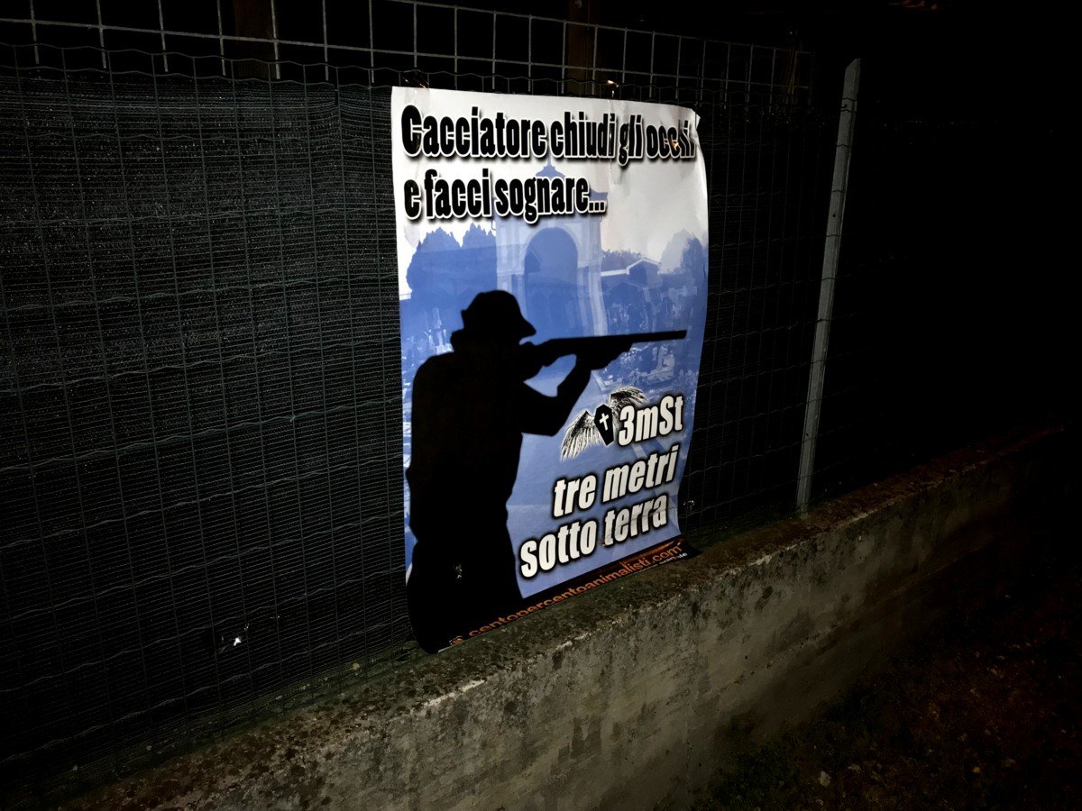 Per far capire al cacciatore e al sindaco che Centopercentoanimalisti non starà a guardare, nella notte tra il 3 e 4 aprile, Militanti del Movimento hanno affisso alcuni manifesti ironici contro la caccia sulla recinzione dove si trova il povero Cane in via Fontane a Montemerlo e sul Municipio di Cervarese Santa Croce (Padova).