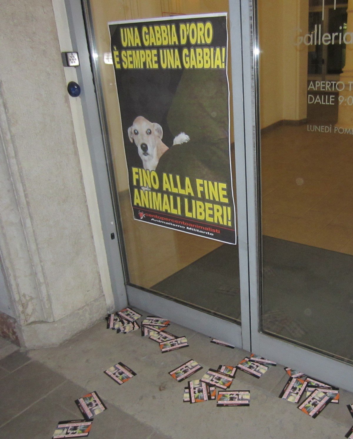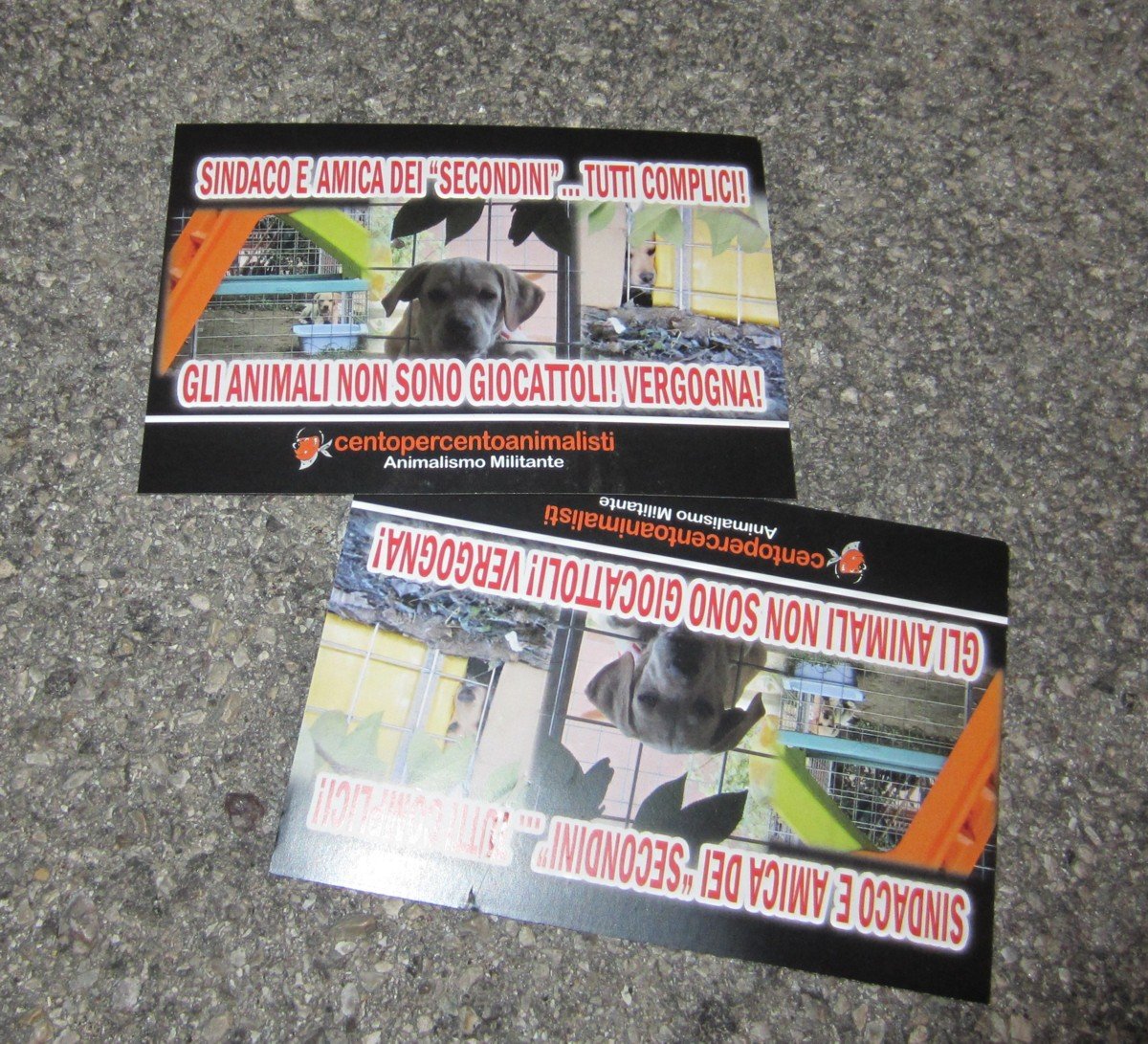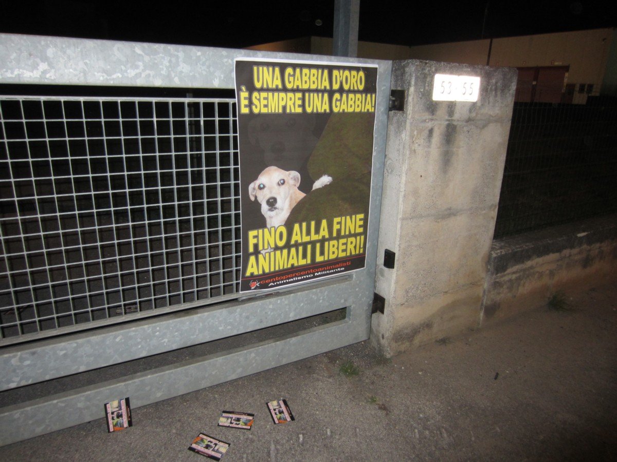 Militanti di CENTOPERCENTOANIMALISTI, nella notte tra il 23 e 24 agosto, hanno affisso striscioni del Movimento e lanciato decine di volantini di denuncia a Cittadella, precisamente sulla porta d’ingresso del Municipio (per la giunta una gabbia di 2 metri X 2 è regolare), nel giardino dei “secondini” dove si trova il povero Cucciolo, presso la ditta dove lavora chi ha dato loro il Cagnolino e nega il maltrattamento.