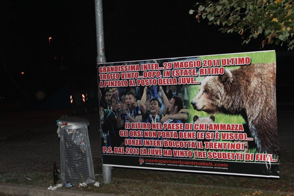 Luoghi belli e ben organizzati ce ne sono tanti in Italia, non contaminati dalla malvagità dei loro abitanti. Il ritiro a Pinzolo non porta bene, come è scritto sullo striscione gigante affisso dai militanti di CENTOPERCENTOANIMALISTI alla sede dell’Inter ad Appiano Gentile nella notte tra il 28 e 29 settembre, anche perché, dopo la sconfitta casalinga contro il modesto Cagliari, sono tornate le nubi in casa neroazzurra.