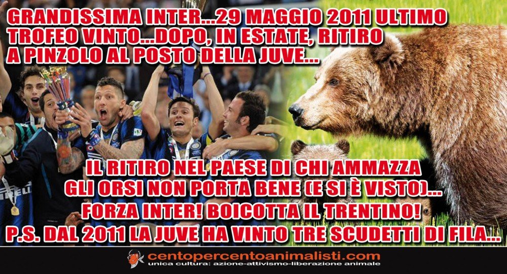 Augurando alla gloriosa Inter di riprendersi presto, le azioni di boicottaggio di Centopercentoanimalisti continueranno. Colpire l’economia del Trentino con ogni mezzo legittimo, questo è il nostro obiettivo strategico, sempre e comunque con azioni dirette.