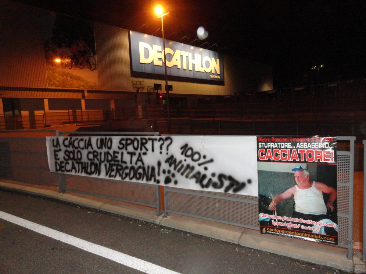 Militanti di CENTOPERCENTOANIMALISTI nella notte tra il 27 e 28 marzo, hanno affisso sulla recinzione del punto vendita Decathlon in via Varese, 1 a Saronno, un manifesto con l’icona per eccellenza dei cacciatori Pietro Pacciani e uno striscione che invita l’azienda a riflettere. Decathlon dimostri buon senso e faccia un passo indietro, non sono da escludere altre azioni e presidi di protesta anche in altre città.