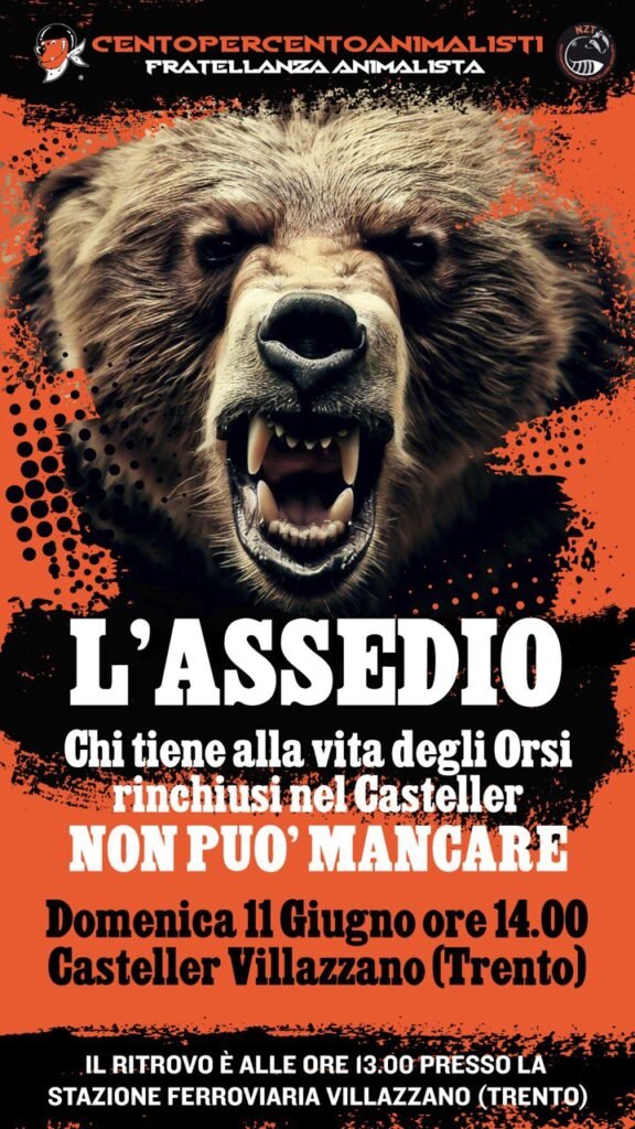 Siamo curiosi di vedere fino a che punto vi interesserà la sorte degli Orsi ed essere attivi domenica 11 giugno, quindi non solo sui social. Il presidio è aperto a tutti, nessuno escluso, ma sopratutto è aperto agli Animalisti che sono stanchi di ascoltare parole e parole, sia nei TG, sia alle manifestazioni. Ovviamente ci sono altri eventi in programma in futuro per la liberazione degli Orsi, ognuno sceglie il modo più consono per attivarsi, ma alla nostra manifestazione, domenica 11 giugno, il Casteller dovrà tremare, non a caso l’evento è stato nominato “l’assedio”. I nostri fratelli dovranno sentire la nostra presenza.