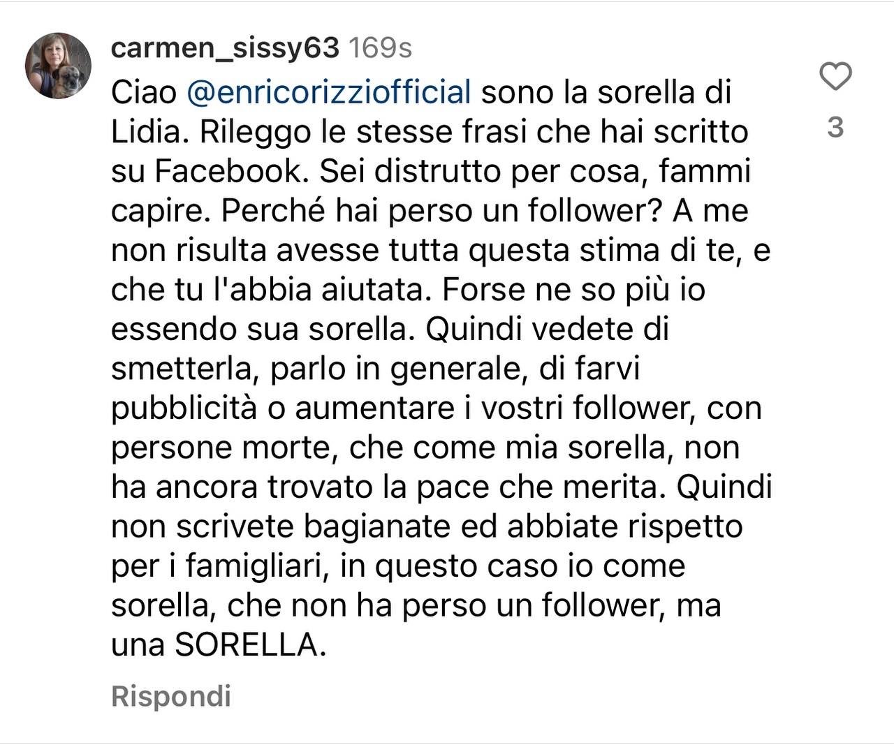 Questa la testimonianza della sorella della povera Lidia che lo accusava di speculare sul tragico femminicidio. Enrico Rizzi sei un uomo di merda degno della infame (cacciata da FB per truffa) che ti ha messo al mondo, 58 anni portati di merda.