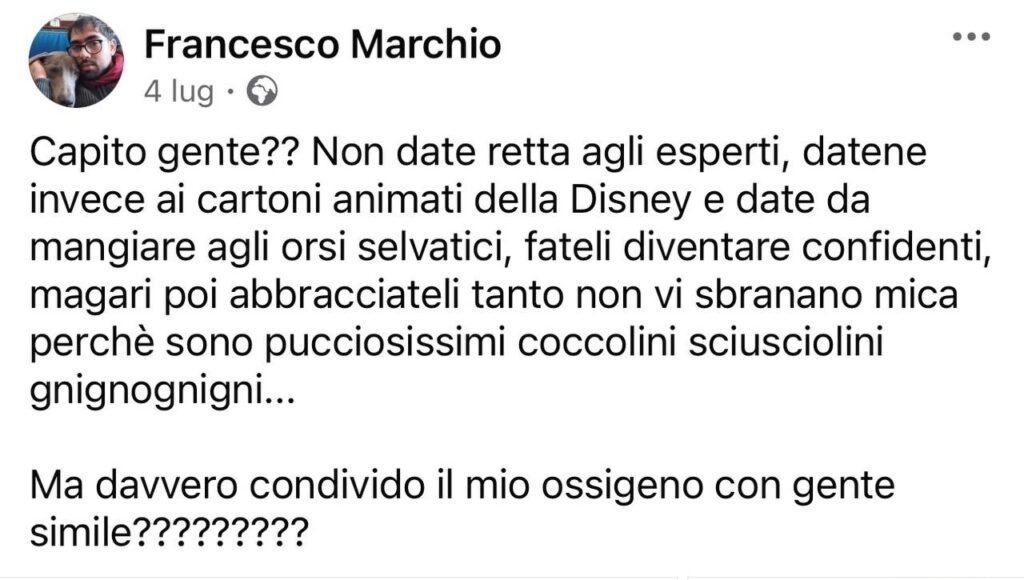 Da tanto tempo non parlavamo più dei ritardati da tastiera che odiano gli Animali, sono praticamente tutti scomparsi, le loro pagine anti animaliste ridotte alla miseria, ciononostante, c’è un coglione che persiste a scrivere cazzate sui social, tale Francesco Marchio di Andria.