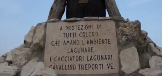 Nel filmato si può leggere anche la dedica scolpita sulla targa di marmo posizionata alla base che fa da piedistallo della bricola che recita «A protezione di tutti coloro che amano l’ambiente lagunare». Firmata sotto «I cacciatori lagunari Cavallino Treporti Ve».