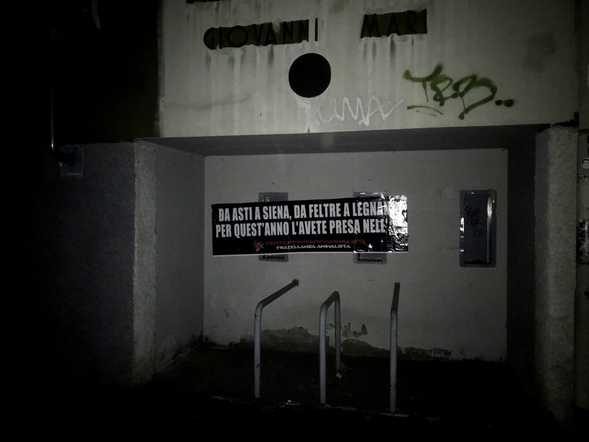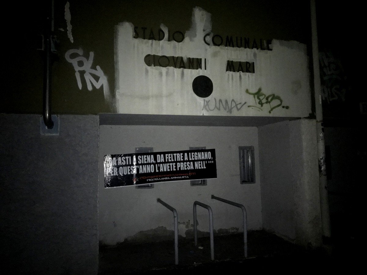 Nella notte tra il 2 e 3 luglio (data del 2 luglio scelta non a caso, Siena docet), i nostri Militanti hanno pensato di rendere “omaggio” a questi signori affiggendo un lungo striscione provocatorio ed ironico, all’ingresso delle tribune dello stadio “Mari” di Legnano…