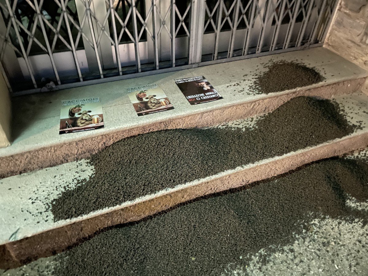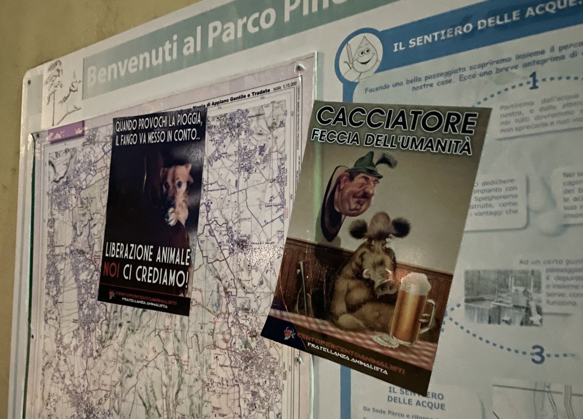 Per far capire che al presidente del parco Pineta (e non solo lui) che gli Animali non sono bersagli per gli assassini legalizzati, e che noi non molleremo le nostre legittime proteste, nella prima serata di mercoledì 19 maggio, alcuni Militanti del Movimento Centopercentoanimalisti hanno versato oltre 30 Kg di letame (puzzolente) davanti all’ingresso della sede del parco Pineta, in via Manzoni, 11 a Castelnuovo Bozzente (Como), inoltre sono stati appiccati manifesti contro i cacciatori e altri di “riflessione”. Fino alla fine Animali liberi!