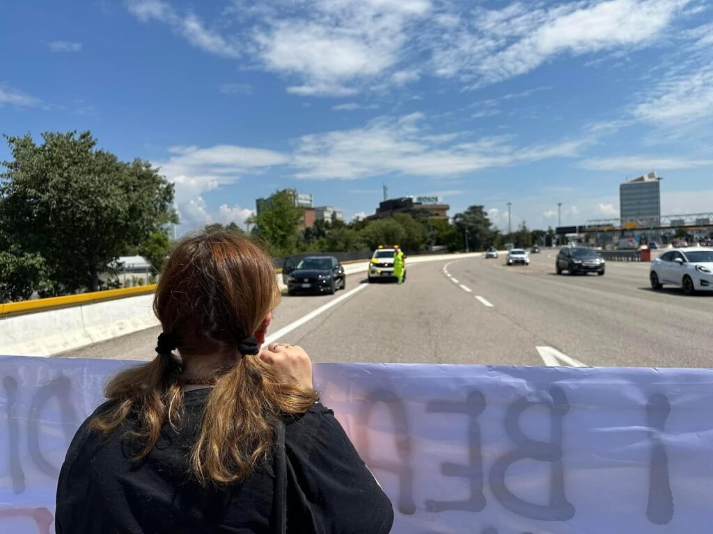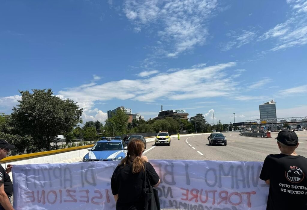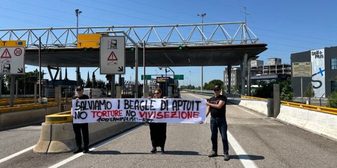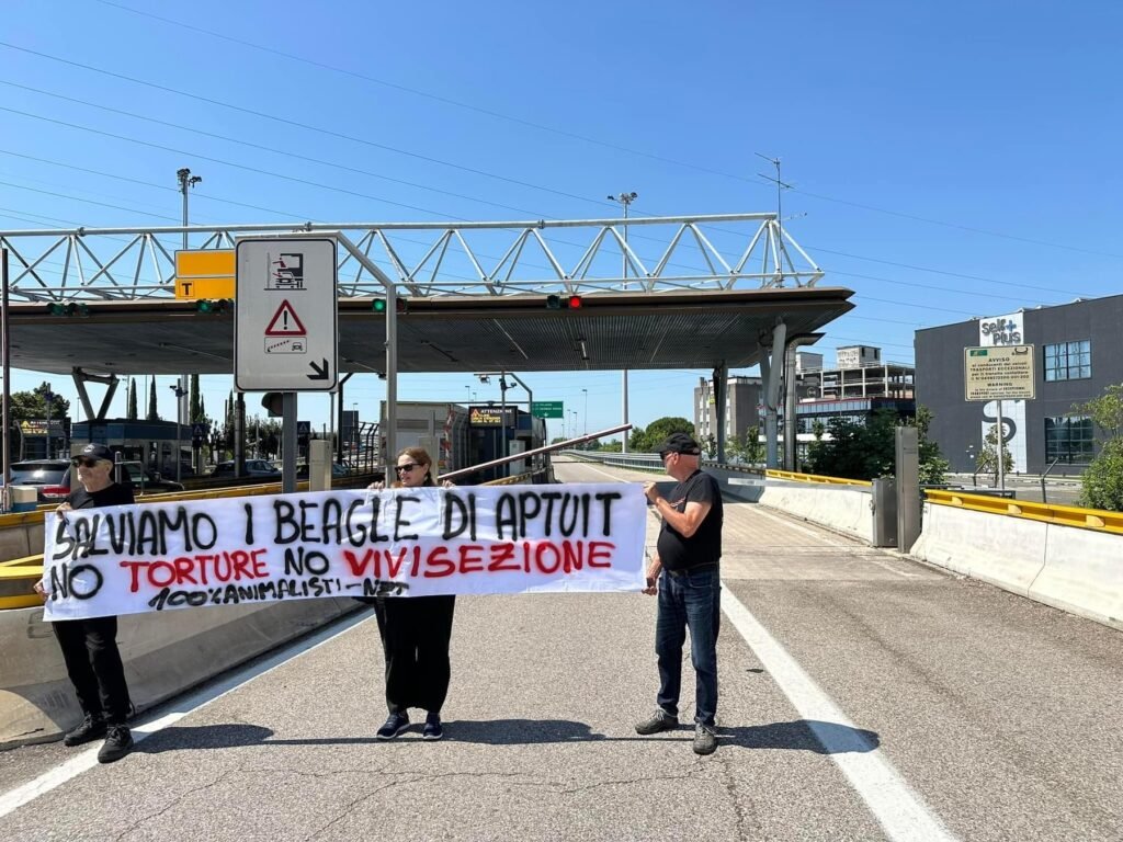Contro la falsa scienza, che è solo speculazione, contro crudeltà che non servono a nulla, militanti di CENTOPERCENTOANIMALISTI sabato 20 luglio, alle 12 circa, hanno bloccato una entrata del casello di Verona Sud esponendo uno striscione: salviamo i Beagle di Aptuit – non torture, no vivisezione.