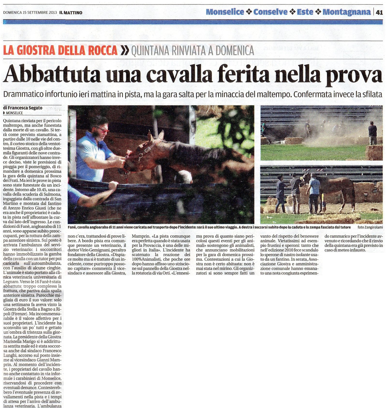 Alla giostra di Monselice (Padova) un cavallo è rimasto infortunato ed è stato abbattuto subito dopo, l’ennesima prova di quanto siano pericolosi questi eventi per gli animali, che, a differenza degli umani sono costretti a partecipare senza possibilità di scelta.