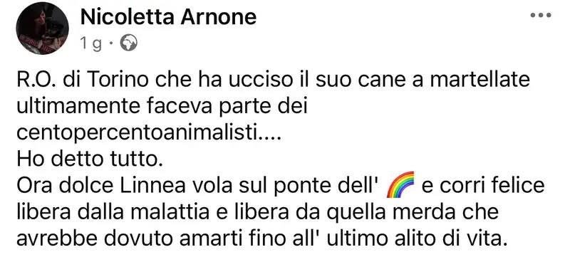 Notiamo che le calunnie del fronte animalaro di Roberto Serafin sulla tragedia di Torino, continuano. Questa volta si tratta di un’altra loro attivista, tale Nicoletta Arnone alias Asia Sophia Mia. Anche lei ha speculato su una tragedia accaduta a Torino, per divulgare falsità.