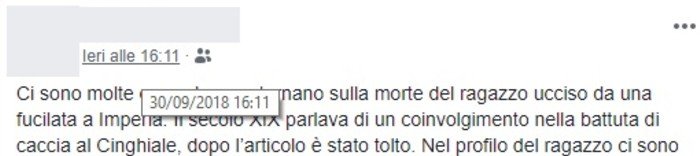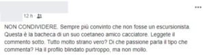 La mattina successiva alla disgrazia, seguo i suoi amici cacciatori nelle loro bacheche pubbliche e noto il commento confidenziale di uno in particolare (un amico cacciatore di Cinghiali non virtuale, ma reale), più il commento di un altro che non ammette equivoci.