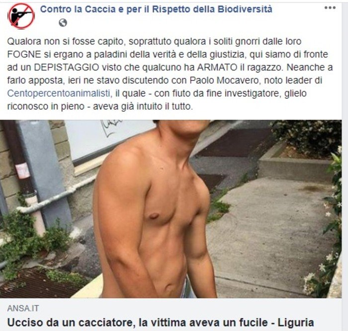 Vado a vedere il profilo del ragazzo morto, noto una classica maglietta da cacciatore in una foto (quella di copertina), guardo la lista degli amici e noto diversi amici cacciatori di Cinghiali. Cerco di capire in fretta e fare due più due. Un ragazzo esce di casa alle 7 del mattino per fare una passeggiata nei boschi, un caso più unico che raro, alle 8 viene colpito a morte da una fucilata. Iniziano i comunicati dei “Mennea” degli Animalisti, tutti fanno a gara a chi arriva prima per ottenere un pò di visibilità e like (certi fanno proprio pena), nessuno di loro si è chiesto cosa ci facesse una ragazzo così giovane in quel bosco dove i cartelli che annunciavano una battuta di caccia al Cinghiale si sprecavano. Mi sento al telefono con Rosario, un admin di una nota pagina contro la caccia, gli elenco i miei dubbi sulla versione dell’escursione e le mie motivate perplessità, sostengo che quel ragazzo si trovava in quel luogo perché partecipava attivamente alla battuta di caccia al Cinghiale. Ma andiamo avanti.