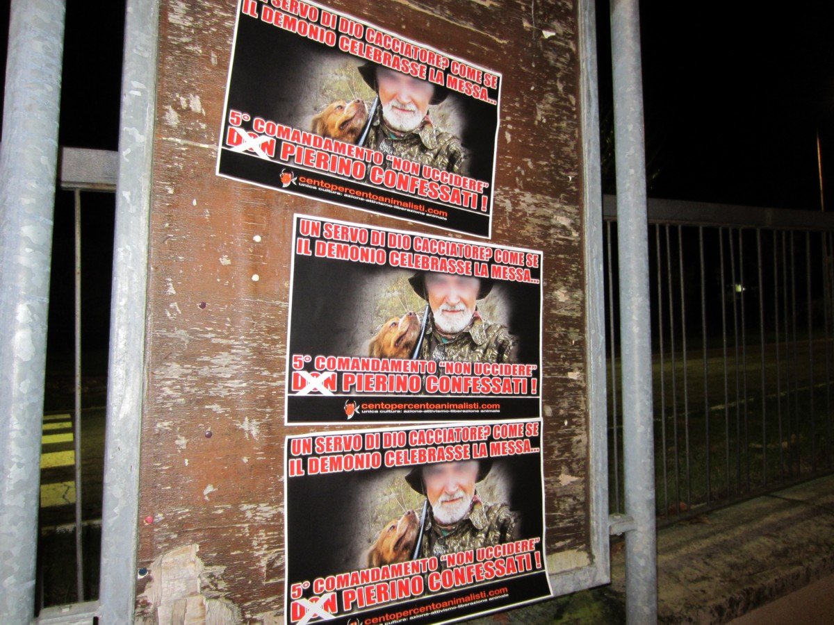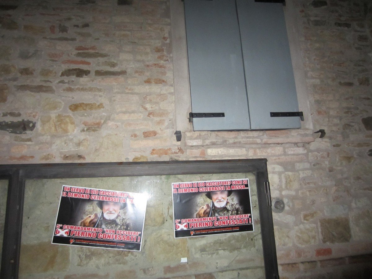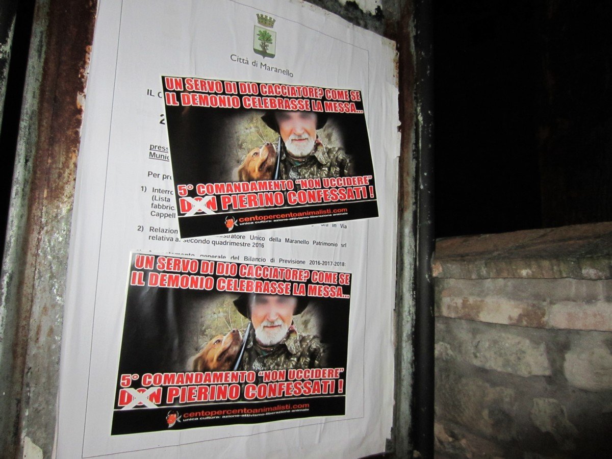 Militanti di CENTOPERCENTOANIMALISTI, nella notte tra il 1° e il 2 dicembre, hanno tappezzato Torre Maina di Maranello con decine di locandine adesive stampate per l’occasione, durante il blitz notturno non sono state risparmiate nemmeno la chiesa, la canonica e la locazione del presepe.
