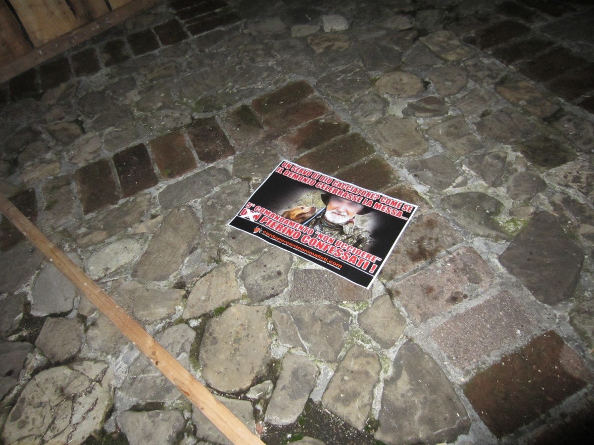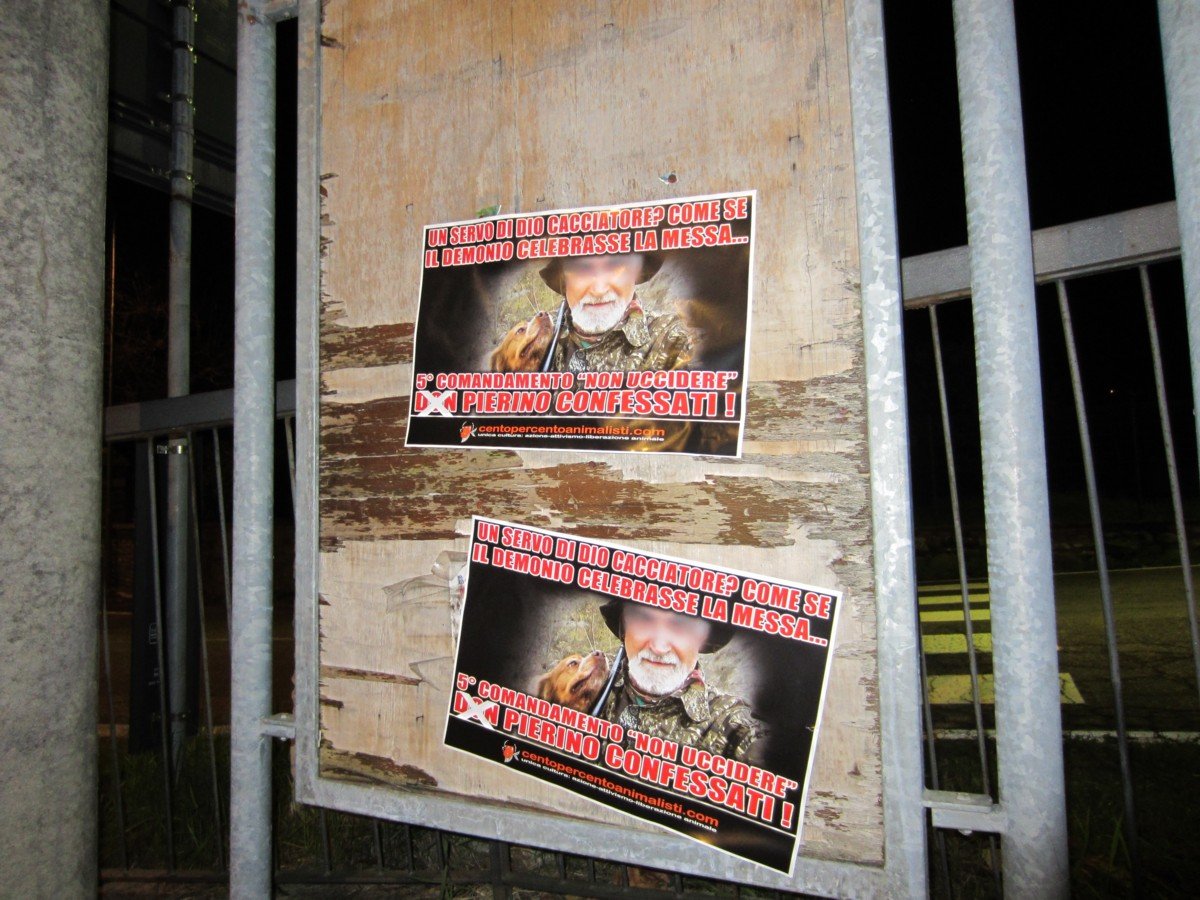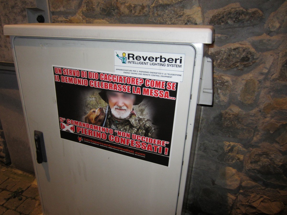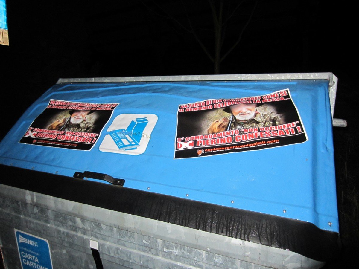 Militanti di CENTOPERCENTOANIMALISTI, nella notte tra il 1° e il 2 dicembre, hanno tappezzato Torre Maina di Maranello con decine di locandine adesive stampate per l’occasione, durante il blitz notturno non sono state risparmiate nemmeno la chiesa, la canonica e la locazione del presepe.
