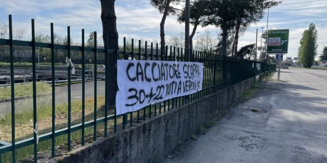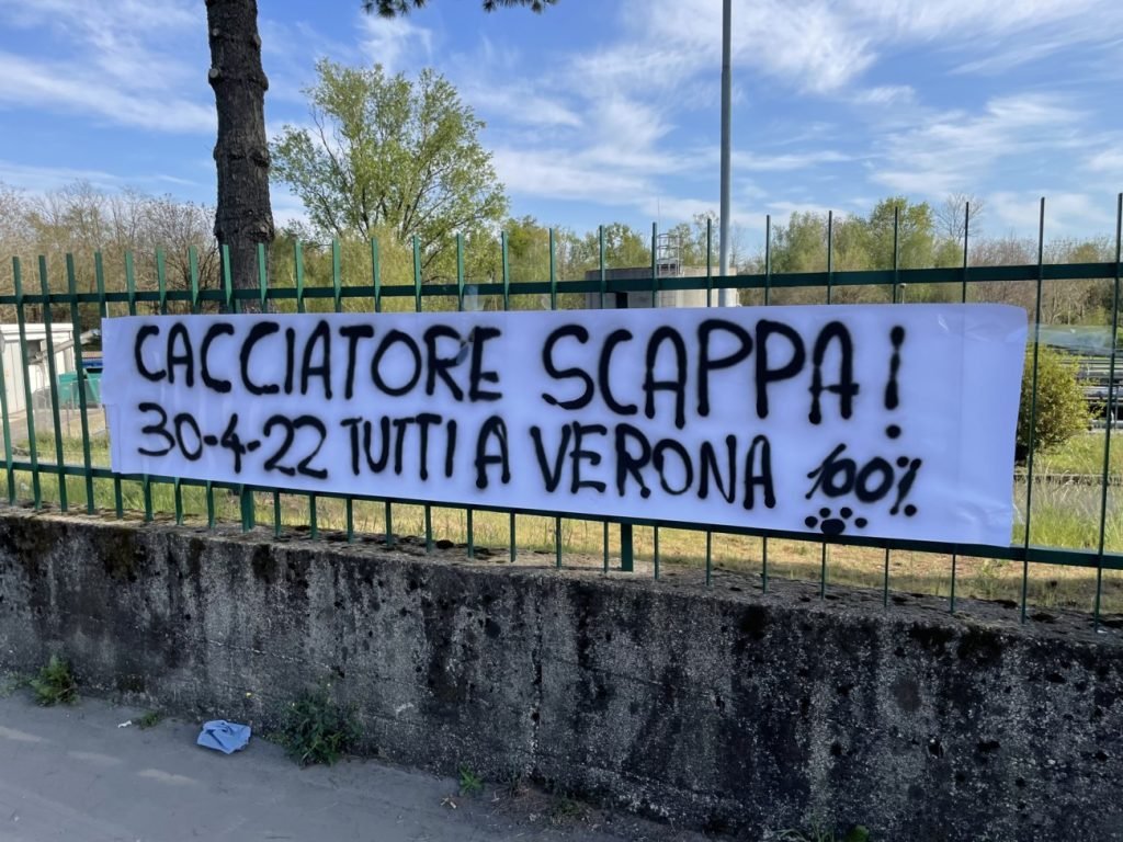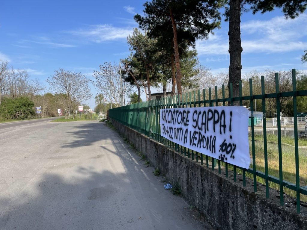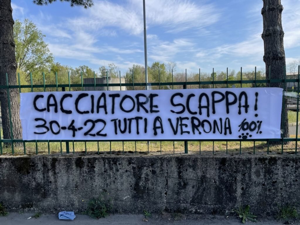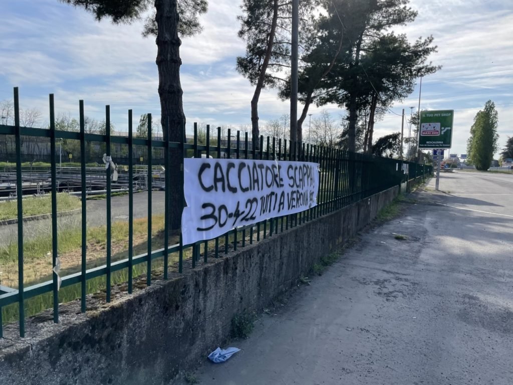 Militanti di Centopercentoanimalisti, domenica pomeriggio 17 aprile,  hanno quindi pensato di esporre uno striscione sui cancelli del depuratore che si trova sulla strada provinciale 527 con il testo “cacciatore scappa! 30 – 4 – 22 tutti a Verona!”
