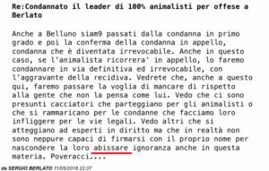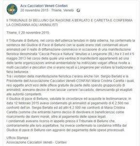 Noi di Centopercentoanimalisti siamo fatti così, attendiamo pazienti sulla riva del fiume. Nel 2015 il leader di Centopercentoanimalisti Paolo Mocavero e il leader del Fronte Animalista Roberto Serafin, vennero condannati anche in appello dal giudice di pace di Belluno, per aver offeso l’europarlamentare Sergio Berlato e Cristina Caretta durante una manifestazione contro la fiera della caccia a Longarone (BL).