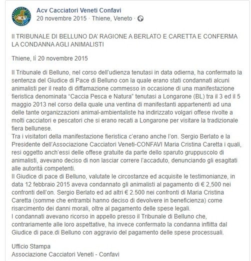 Noi di Centopercentoanimalisti siamo fatti così, attendiamo pazienti sulla riva del fiume. Nel 2015 il leader di Centopercentoanimalisti Paolo Mocavero e il leader del Fronte Animalista Roberto Serafin, vennero condannati anche in appello dal giudice di pace di Belluno, per aver offeso l’europarlamentare Sergio Berlato e Cristina Caretta durante una manifestazione contro la fiera della caccia a Longarone (BL).