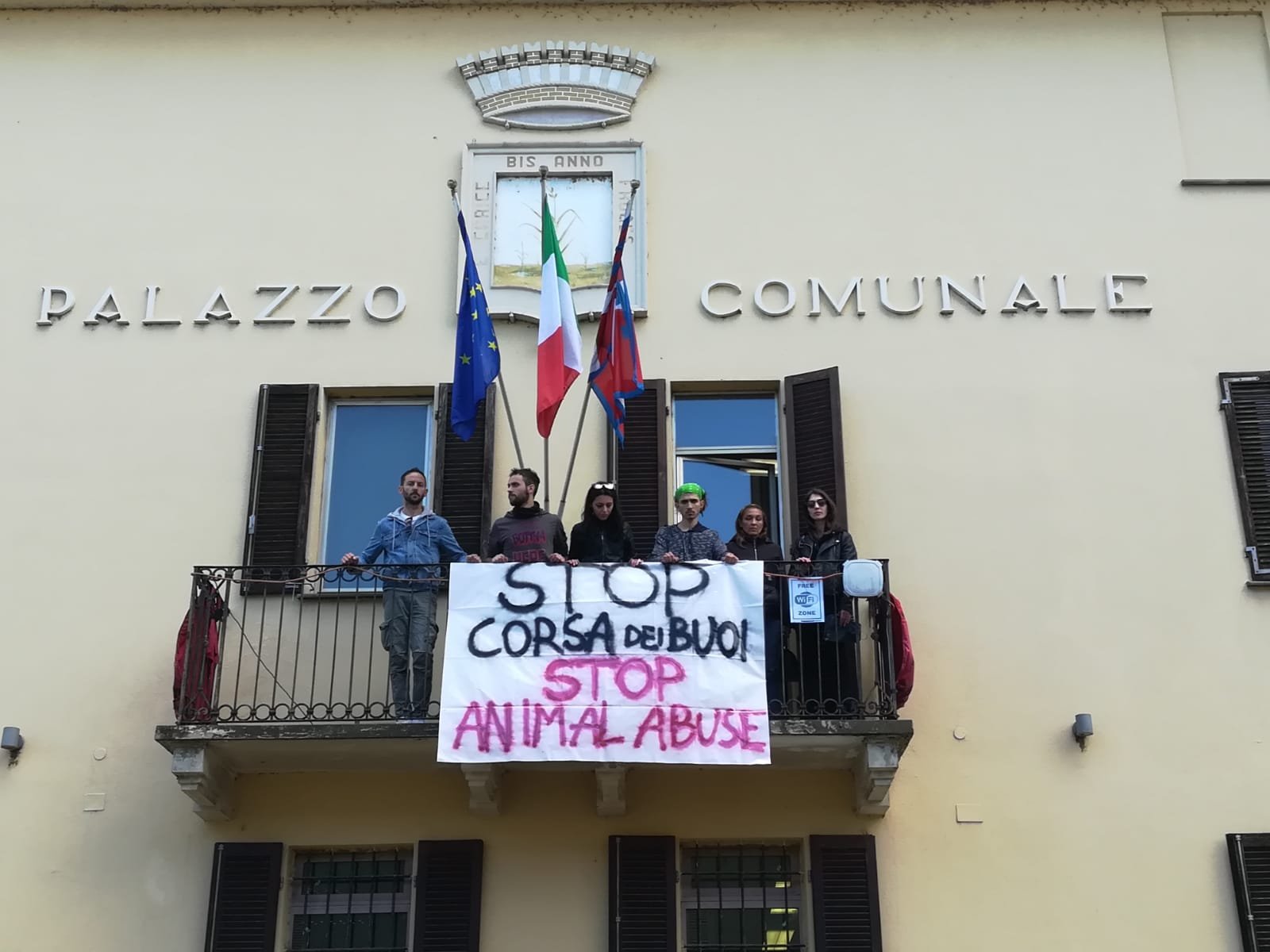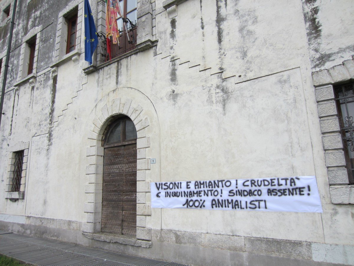 Dopo il presidio tenuto sabato 18 marzo davanti all’allevamento di Visoni a Villadose, militanti di CENTOPERCENTOANIMALISTI, mercoledì 22 marzo hanno affisso in pieno giorno uno striscione sui muri del municipio, per ricordare al Sindaco le sue responsabilità. Se è vero che gli attuali operatori hanno rilevato una licenza di allevamento …