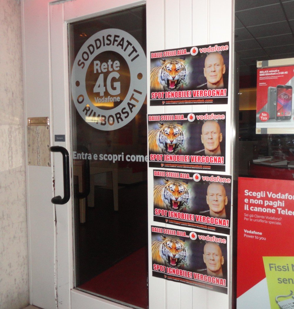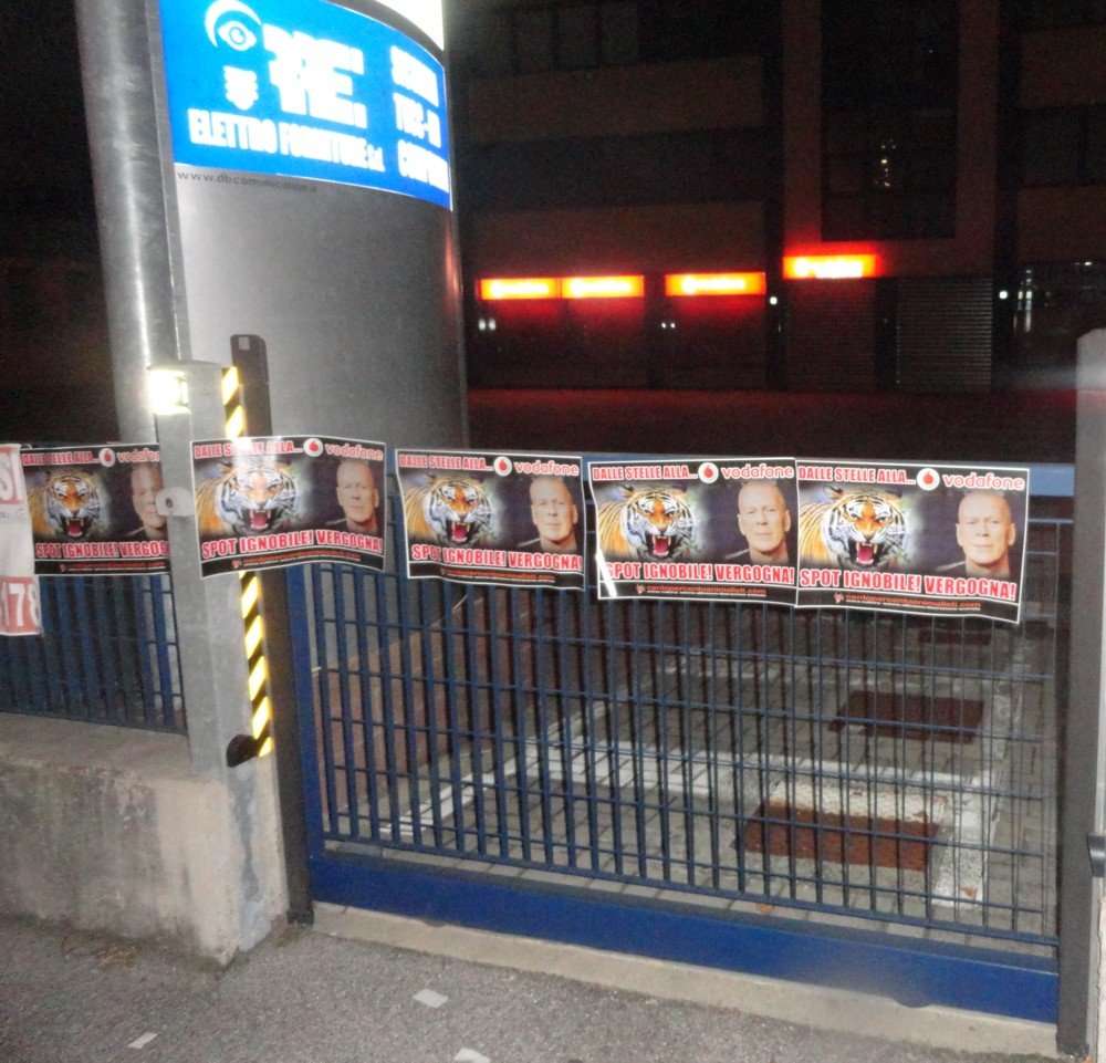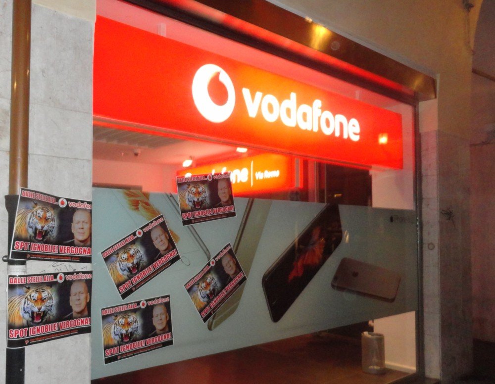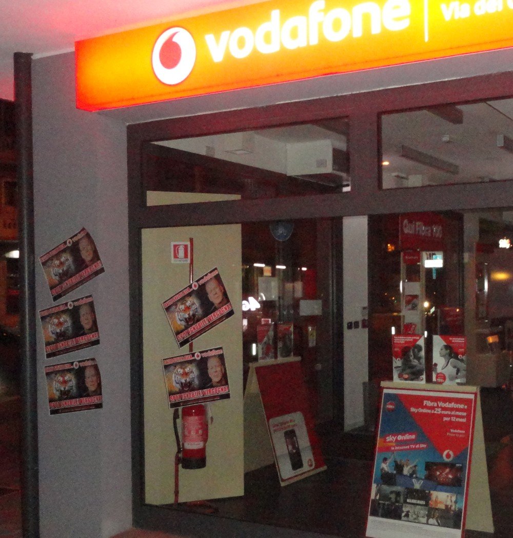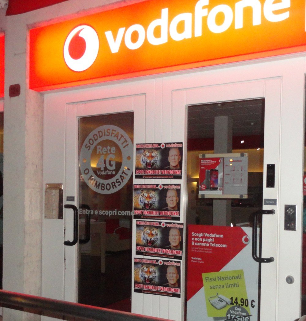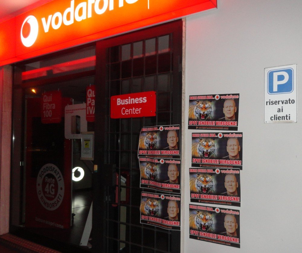 Nella notte tra il 27 e 28 ottobre, le vetrine e i muri dei principali Vodafone store di Padova sono stati tappezzati con locandine adesive con la stessa immagine e con lo stesso slogan. Invitiamo nuovamente la Vodafone ad ammettere l’errore di comunicazione e togliere lo spot ignobile dai palinsesti pubblicitari.